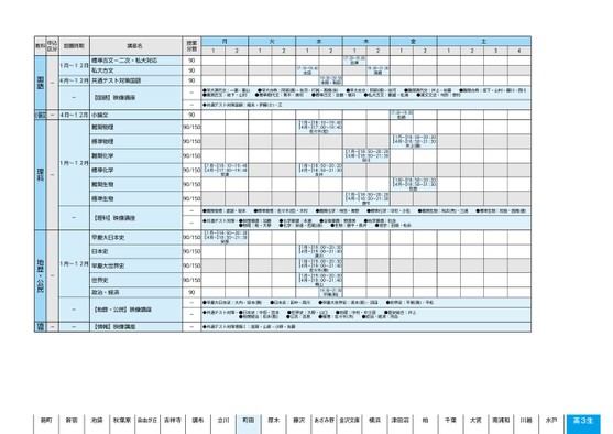 町田--区分教科申込-認定レベルコード講座名-9090--授業-90分数90-----月●日本史:田中・西川●世界史:大野・山口●公共:吉見火●日本史:田中・西川●世界史:大野・山口●公共:吉見1●日本史:田中・西川●日本史:田中・西川19:30〜21:00●早慶大世界史:坂本(新)・沼田19:30〜21:00【4月〜】19:00〜21:40【4月〜】19:00〜21:40【1月〜】19:00〜20:30【1月〜】19:00〜20:30【4月〜】19:00〜21:40●早慶大世界史:坂本(新)・沼田【1月〜】19:00〜20:30【4月〜】19:00〜21:40【4月〜】19:00〜21:40【1月〜】19:00〜20:30【1月〜】19:00〜20:30【4月〜】19:00〜21:40【1月〜】19:00〜20:3019:30〜21:0019:30〜21:00●早慶大世界史:坂本(新)・沼田2水●倫理:佐々木(洋)●早慶大世界史:坂本(新)・沼田●倫理:佐々木(洋)木金土12◆共通テスト対策情報Ⅰ:加賀・山家・小野・佐藤◆共通テスト対策…●日本史:中垣・宮本●早慶大日本史:大内・坂本(勝)●早慶大日本史:大内・坂本(勝)1●早慶大日本史:大内・坂本(勝)◆共通テスト対策…●日本史:中垣・宮本●地理総合:松本(聡)●早慶大日本史:大内・坂本(勝)◆共通テスト対策情報Ⅰ:加賀・山家・小野・佐藤◆共通テスト対策情報Ⅰ:加賀・山家・小野・佐藤●地理総合:松本(聡)221121234地歴・公民歴・公民--------------情情報【国語】映像講座【地歴・公民】映像講座【理科】映像講座【情報】映像講座政治・経済早慶大世界史早慶大日本史政治・経済【地歴・公民】映像講座【情報】映像講座【情報】映像講座【地歴・公民】映像講座世界史世界史早慶大世界史【理科】映像講座難関生物【理科】映像講座難関化学標準物理難関物理小論文小論文私大古文小論文私大古文共通テスト対策国語標準古文-二次・私大対応私大古文【理科】映像講座【理科】映像講座早慶大日本史日本史早慶大日本史共通テスト対策国語標準化学小論文【国語】映像講座難関化学【国語】映像講座標準古文-二次・私大対応早大古典ト対策国語早大古典早大古文早大古文早大古文標準現代文-二次・私大対応講座名【国語】映像講座標準現代文-二次・私大対応標準現代文-二次・私大対応標準古文-二次・私大対応標準古文-二次・私大対応私大古文標準古文-二次・私大対応私大古文標準古文-二次・私大対応講座名講座名私大古文共通テスト対策国語スト対策国語共通テスト対策国語共通テスト対策国語【国語】映像講座私大古文共通テスト対策国語小論文【理科】映像講座標準生物【理科】映像講座【理科】映像講座標準生物標準化学早慶大日本史難関生物難関生物標準化学【理科】映像講座標準物理標準物理標準生物難関物理難関生物小論文難関物理難関化学難関化学標準化学標準生物政治・経済【地歴・公民】映像講座【地歴・公民】映像講座政治・経済5ページ校了時削除●2024年度/入塾/東日本/町田/高3生/パターン国語区分教科申込--教科申込-----区分教科申込1月〜12月4月〜12月1月〜12月認定レベル4月〜12月1月〜12月1月〜12月--909090909090909090909090---909090-90909090-90授業分数90909090-授業90909090授業分909090909090-17:10〜18:40太田【1月〜】17:30〜19:0017:30〜19:0019:30〜21:00【4月〜】17:30〜20:20【4月〜】17:30〜20:2017:30〜19:0017:30〜19:0017:30〜19:00宮崎19:20〜20:50本間・税田19:20〜20:50本間・税田--◆共通テスト対策国語:福永・伊藤(さ)・江◆共通テスト対策国語:福永・伊藤(さ)・江小論文小論文4月〜12月1月〜12月認定レベル4月〜12月コード4月〜12月1月〜12月設置時期4月〜12月認定レベル4月〜12月4月〜12月4月〜12月4月〜12月1月〜12月17:30〜19:0017:30〜19:00松崎松崎理科-1月〜12月1月〜12月4月〜12月4月〜12月4月〜12月4月〜12月4月〜12月--◆共通テスト対策…●物理基礎:加藤【1月〜】18:10〜19:40【1月〜】18:10〜19:40【1月〜】18:10〜19:40●理:乾・大學【4月〜】17:00〜19:40●難関物理:渡部・坂本【4月〜】17:00〜19:40【1月〜】18:50〜20:20●標準物理:佐々木(哲)・木村●化学:安達・西尾(源)●難関化学:寺田・青野永井永井永井●化学基礎:本瀬●標準化学:中村・小松●難関生物:向井(亮)・三浦●標準生物:牧島・西尾(健)地歴・公民歴・公民-認定レベル1月〜12月1月〜12月1月〜12月1月〜12月認定レベル平尾(則)平尾(則)平尾(則)●世界史:平尾(雅)・平松●世界史:平尾(雅)・平松●世界史:平尾(雅)・平松度/入塾/東日本/町田/高3生/パターン6617/2024_51_3_325_33_20230901093653.csvコード月火水木金土121●早大古典:阿部(順)・佐河・打越・髙橋(佳)2121212●難関現代文:井上・佐藤1234国語1月〜12月宮崎吉澤宮崎宮崎17:10〜18:40太田19:30〜21:00宮崎19:20〜20:50本間・税田-●難関古文:坂下・山村●早大現代文:一瀬・菱山◆共通テスト対策国語:福永・伊藤(さ)・江●早大現代文:一瀬・菱山●難関古文:坂下・山村◆共通テスト対策国語:福永・伊藤(さ)・江【1月〜】18:10〜19:40◆共通テスト対策国語:福永・伊藤(さ)・江◆共通テスト対策国語:福永・伊藤(さ)・江【4月〜】17:00〜19:40◆共通テスト対策国語:福永・伊藤(さ)・江◆共通テスト対策国語:福永・伊藤(さ)・江●早大現代文:一瀬・菱山古文坂下・山村小論文国語--17:30〜19:00【1月〜】18:50〜20:20【4月〜】18:50〜21:30松崎理科-1