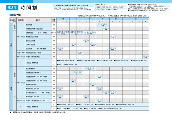 時間割授業形式は、「対面」「映像」「オンライン」があります。「対面」「映像」:ラインアップは、以下の時間割をご確認ください。「オンライン」:オンライン授業のラインアップは、47ページをご覧ください。*申込区分について認定制「認定(受講資格)」の取得が必要な講座です。ーどなたでも受講できる講座です。●受験対策講座(映像)のみのお申し込みはできません。受験対策講座(対面/オンライン〈総合型・学校推薦型選抜対策プログラムを除く〉)と組み合わせて、お申し込みください。●同一名称の講座は設置校舎・曜日・時間帯・授業形式が異なっても同一内容です。●担当講師は変更になる場合がありますので、あらかじめご了承ください。高3生藤沢●藤沢館※講座によって設置時期が異なります。※表紙に記載の「時間割の見方」を必ずご確認ください。金土121234木1217:10〜19:50中島19:00〜21:40遠藤月火水121212授業分数150150東大英語特別選抜英語-国公立大認定制教科申込区分認定レベル設置時期コード講座名早慶大英語★=4月増設90/150【1月〜】19:10〜20:40【4月〜】18:00〜20:40木村(智)【1月〜】19:00〜20:30【4月〜】19:00〜21:40天倉【4月〜】18:00〜20:40二本柳★17:10〜18:40田口17:10〜18:40天倉20:00〜21:30伊藤(宏)17:20〜18:50大島19:10〜20:40可愛18:10〜19:40大胡18:10〜19:40岡本★●早慶大英語:柴田(卓)・髙橋(慶)●難関国公立大英語:佐野・胡摩﨑●国公立大英語:安井・近藤●私大英語:吉川(量)・大島●入試頻出英文法・語法:小林19:00〜20:30可愛◆共通テスト対策英語:柴田(祐)・守屋18:20〜21:00岩村17:10〜19:50堺17:20〜18:50堀尾17:10〜18:40板谷20:00〜21:30瀬谷17:20〜18:50中谷19:20〜20:50中谷17:10〜18:40岩村★18:10〜19:40瀬谷18:00〜19:30村本18:00〜19:30前田18:00〜19:30富田●難関理系数学ⅢC:依田・山本●難関数学ⅠAⅡBC:原・宮田●標準理系数学ⅢC:高梨(大)・波平●標準数学ⅠAⅡBC:秦野・永島◆共通テスト対策…●数学ⅠAⅡBC:森本・清水●数学ⅠA:森本・清水●数学C「平面上の曲線と複素数平面」:湘田909090909090--15015090909090909090--1月〜12月難関国公立大英語国公立大英語GMARCH英語-私大英語★=4月増設1月〜7月入試頻出英文法・語法4月〜12月共通テスト対策英語-【英語】映像講座東大理類数学特別選抜理系数学ⅢC特別選抜数学ⅠAⅡBC-理系特別選抜数学ⅠAⅡBC-文系難関理系数学ⅢC難関数学ⅠAⅡBC標準理系数学ⅢC★=4月増設1月〜12月認定制-標準数学ⅠAⅡBC4月〜12月共通テスト対策数学ⅠAⅡBC-【数学】映像講座英語数学1ページ●2024年度/入塾/東日本/藤沢/高3生/パターン4617/2024_51_3_331_33_20230901094506.csv日本0校了時削除★:講師名に★印がある授業は、1学期(4月/第10講)から開始となります。藤沢2ペ
