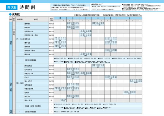 ※講座によって設置時期が異なります。※表紙に記載の「時間割の見方」を必ずご確認ください。水水2211木木11【1月〜】18:20〜19:50【4月〜】17:10〜19:50佐々木(哲)22【1月〜】19:10〜20:40【4月〜】18:00〜20:4012金合田金12土土22331144【1月〜】19:10〜20:40【4月〜】18:00〜20:40木村火火11【1月〜】20:10〜21:40【4月〜】19:00〜21:40井上(順)22【1月〜】20:10〜21:40【4月〜】19:00〜21:40【1月〜】19:10〜20:40【4月〜】18:00〜20:40井上(順)【1月〜】19:10〜20:40【4月〜】18:00〜20:40【1月〜】19:10〜20:40【4月〜】18:00〜20:40小竹小竹寺田寺田【1月〜】18:10〜19:40【4月〜】17:00〜19:40【1月〜】18:10〜19:40【4月〜】17:00〜19:40【1月〜】20:00〜21:30【4月〜】18:50〜21:30【1月〜】19:10〜20:40【4月〜】18:00〜20:40【1月〜】19:10〜20:40【4月〜】18:00〜20:40浅利浅利原原長井長井●標準化学:中村・小松●難関生物:向井(亮)・三浦●標準生物:牧島・西尾(健)●標準物理:佐々木(哲)・木村【1月〜】20:10〜21:40【4月〜】19:00〜21:40●難関化学:寺田・青野【1月〜】20:10〜21:40【4月〜】19:00〜21:40山野井山野井【1月〜】20:00〜21:30【4月〜】18:50〜21:30田中【1月〜】18:50〜20:20【4月〜】18:50〜21:30依田【1月〜】18:50〜20:20【1月〜】19:10〜20:40【4月〜】18:50〜21:30【1月〜】18:00〜19:30【4月〜】18:00〜20:40【1月〜】19:10〜20:40【1月〜】20:10〜21:40【4月〜】18:00〜20:40【1月〜】18:00〜19:30【4月〜】18:00〜20:40坂本(勝)依田坂本(勝)黒川竹内竹内【1月〜】20:10〜21:40【4月〜】19:00〜21:40【1月〜】18:20〜19:50【4月〜】17:10〜19:50【1月〜】20:10〜21:40【4月〜】19:00〜21:40【1月〜】20:10〜21:40【4月〜】19:00〜21:40安部安部【1月〜】18:00〜19:30【4月〜】18:00〜20:40坂本(新)【1月〜】18:00〜19:30【4月〜】18:00〜20:40坂本(新)【1月〜】17:40〜19:10【4月〜】16:30〜19:10【1月〜】17:40〜19:10【4月〜】16:30〜19:10斉藤斉藤-◆共通テスト対策…●物理基礎:加藤●難関物理:渡部・坂本●物理:乾・大學●標準物理:佐々木(哲)・木村●化学基礎:本瀬●化学:安達・西尾(源)●生物基礎:野黒美●難関化学:寺田・青野●生物:唐牛・長井●地学基礎:松永●標準化学:中村・小松●地学:田島・松永●難関生物:向井(亮)・三浦●標準生物:牧島・西尾(健)90/150-◆共通テスト対策…●物理基礎:加藤●物理:乾・大學●化学基礎:本瀬●化学:安達・西尾(源)●生物基礎:野黒美●生物:唐牛・長井【1月〜】20:00〜21:30【4月〜】18:50〜21:30●地学基礎:松永田中●地学:田島・松永-90◆共通テスト対策国語:福永・伊藤(さ)・江17:20〜18:50授業形式は、「対面」「映像」「オンライン」があります。田本「対面」「映像」:ラインアップは、以下の時間割をご確認ください。90「オンライン」:オンライン授業のラインアップは、47ページをご覧ください。*申込区分について認定制ー「認定(受講資格)」の取得が必要な講座です。17:30〜19:00どなたでも受講できる講座です。清水(瑞)●受験対策講座(映像)のみのお申し込みはできません。受験対策講座(対面/オンライン〈総合型・学校推薦型選抜対策プログラムを除く〉)と組み合わせて、お申し込みください。●同一名称の講座は設置校舎・曜日・時間帯・授業形式が異なっても同一内容です。●担当講師は変更になる場合がありますので、あらかじめご了承ください。医系小論文時間割4月〜12月人文・教育系小論文-早慶国公立大対応高3生-小論文社会科学系小論文-早慶国公立大対応9017:20〜18:50山田政治・経済【地歴・公民】映像講座【地歴・公民】映像講座【情報】映像講座【情報】映像講座----●早慶大日本史:大内・坂本(勝)19:30〜21:00平尾(則)●日本史:田中・西川●早慶大世界史:坂本(新)・沼田●世界史:平尾(雅)・平松◆共通テスト対策…●日本史:中垣・宮本●早慶大日本史:大内・坂本(勝)●地理総合:松本(聡)●世界史:大野・山口●日本史:田中・西川●公共:吉見●地理:中村・中土居●早慶大世界史:坂本(新)・沼田●倫理:佐々木(洋)●政治・経済:河合●歴史総合:井上●世界史:平尾(雅)・平松◆共通テスト対策…●日本史:中垣・宮本◆共通テスト対策情報Ⅰ:加賀・山家・小野・佐藤●地理総合:松本(聡)●世界史:大野・山口●公共:吉見●地理:中村・中土居●歴史総合:井上●倫理:佐々木(洋)●政治・経済:河合◆共通テスト対策情報Ⅰ:加賀・山家・小野・佐藤90/15090/150授業分数授業分数90/15090/15090/15090/15090/15090/15090/15090/15090/15090/15090/150月月2211【1月〜】19:10〜20:40【4月〜】18:00〜20:40【1月〜】19:10〜20:40【4月〜】18:00〜20:40【1月〜】20:10〜21:40【4月〜】19:00〜21:40【1月〜】20:10〜21:40【4月〜】19:00〜21:40岡島岡島白石長井90/150-●難関物理:渡部・坂本90/15090/15090/15090/15090/15090/15090/15090/15090/1500-90---【1月〜】19:10〜20:40【4月〜】18:00〜20:40【1月〜】18:20〜19:50【4月〜】17:10〜19:50【1月〜】19:10〜20:40【4月〜】18:00〜20:40【1月〜】19:10〜20:40【4月〜】18:00〜20:40加藤加藤【1月〜】19:10〜20:40【4月〜】18:00〜20:40【1月〜】19:10〜20:40【4月〜】18:00〜20:4019:30〜21:00平尾(則)黒川大野大野沼田中井中井特別選抜物理講座名特別選抜物理-医進標準物理講座名標準物理化学特別選抜化学-医進特別選抜