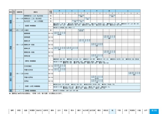 柏教-区分科申込科申込区分--認定レベル1月〜12月1月〜12月1月〜12月1月〜12月認定レベル1月〜1月〜12月コードコード講座名講座名分数授業授業分数月月火火水水木木金金土土1122112211221122112211223344地歴・公民-------------小論文【地歴・公民】映像講座【理科】映像講座【地歴・公民】映像講座日本史早慶大日本史日本史論述私大古文標準現代文-二次・私大対応早大古文標準生物難関生物-医進標準化学難関化学-医進難関化学標準物理難関物理★=4月増設【国語】映像講座標準古文-二次・私大対応早大古典早大古典★=4月増設難関化学-医進★=4月増設応標準現代文-二次・私大対応難関物理標準古文-二次・私大対応標準現代文-二次・私大対応早大古文★=4月増設標準現代文-二次・私大対応早大現代文私大古文早大現代文【国語】映像講座早大古典標準古文-二次・私大対応小論文早大古文私大古文★=4月増設★=4月増設標準現代文-二次・私大対応私大古文標準古文-二次・私大対応私大古文標準古文-二次・私大対応標準物理★=4月増設私大古文難関生物-医進標準化学難関化学-医進難関化学-医進難関化学標準物理標準生物難関物理難関物理小論文小論文標準化学【国語】映像講座【国語】映像講座【国語】映像講座難関化学私大古文小論文難関生物-医進小論文標準物理【理科】映像講座難関化学標準化学標準生物難関生物-医進★=4月増設★=4月増設標準生物【理科】映像講座【理科】映像講座【理科】映像講座【理科】映像講座早慶大世界史早慶大世界史【理科】映像講座講座日本史早慶大日本史日本史論述世界史世界史【地歴・公民】映像講座【地歴・公民】映像講座【地歴・公民】映像講座----------◆共通テスト対策…●日本史:中垣・宮本●早慶大日本史:大内・坂本(勝)●早慶大日本史:大内・坂本(勝)◆共通テスト対策…●日本史:中垣・宮本●早慶大日本史:大内・坂本(勝)●早慶大日本史:大内・坂本(勝)●地理総合:松本(聡)●地理総合:松本(聡)●日本史:田中・西川●日本史:田中・西川●日本史:田中・西川●日本史:田中・西川●早慶大世界史:坂本(新)・沼田●早慶大世界史:坂本(新)・沼田●早慶大世界史:坂本(新)・沼田●早慶大世界史:坂本(新)・沼田●世界史:平尾(雅)・平松●世界史:平尾(雅)・平松●世界史:平尾(雅)・平松●世界史:平尾(雅)・平松情報情報地歴・公----【情報】映像講座【情報】映像講座【情報】映像講座【情報】映像講座◆共通テスト対策情報Ⅰ:加賀・山家・小野・佐藤◆共通テスト対策情報Ⅰ:加賀・山家・小野・佐藤◆共通テスト対策情報Ⅰ:加賀・山家・小野・佐藤◆共通テスト対策情報Ⅰ:加賀・山家・小野・佐藤5ページ●2024年度/入塾/東日本/柏/高3生/パターン6617柏教地歴・公民5ページ2024年ン66柏教柏教区分科申込科申込区分認定レベル認定レベルコードコード講座名講座名授業分数授業分数月月火火水●化学基礎:本瀬●化学:安達・西尾(源)●化学:安達・西尾(源)●化学基礎:本瀬●難関化学:寺田・青野●難関化学:寺田・青野●難関化学:寺田・青野●難関化学:寺田・青野水●化学基礎:本瀬●化学:安達・西尾(源)2木●地学基礎:松永倉田倉田木●生物:唐牛・長井倉田●生物:唐牛・長井2●地学基礎:松永金金土土112211221●標準物理:佐々木(哲)・木村●標準物理:佐々木(哲)・木村●標準物理:佐々木(哲)・木村●標準物:佐々木(哲)・木村11●生物基礎:野黒美●生物基礎:野黒美●生物基礎:野黒美12●地学:田島・松永●地学:田島・松永●標準化学:中村・小松112211223344地歴・公民地歴・公民90/15090/150【4月〜】17:10〜19:50【4月〜】19:00〜21:40【1月〜】20:10〜21:40●難関物理:渡部・坂本◆共通テスト対策…●物理基礎:加藤◆共通テスト対策●物理基礎:加藤●物理:乾・大學●難関物理:渡部・坂本●難関物理渡部・坂本◆共通テスト対策…●物理基礎:加藤●難関物理:渡部・坂本【1月〜】18:20〜19:50【1月〜】18:20〜19:50【1月〜】20:10〜21:40●難関物理:渡部・坂本●難関物理:渡部・坂本●物理:乾・大學●物理:乾・大學山中山90/15090/150大内大90/15090/150【1月〜】20:10〜21:40【4月〜】19:00〜21:40【1月〜】20:10〜21:40髙橋髙90/15090/150【4月〜】19:00〜21:40【4月〜】19:00〜1:40【1月〜】20:10〜21:40【1月〜】20:10〜21:40【1月〜】20:10〜1:40【1月〜】20:10〜21:40坂本(新)()90/15090/150小嶋小●世界史:大野・山口●公共:吉見●世界史:大野・山口●公共:吉見●地理:中村・中土居●地理:中村・中土居●歴史総合:井上●歴史総合:井上●倫理:佐々木(洋)●倫理:佐々木(洋)●政治・経済:河合●政治・経済:河合情地歴・公民校了時削除校了時削除4ページ4ページ●2024年度/入塾/東日柏/高3生/パターン467/202_1_3_322_3国語区分科申込---科教--区分認定レベル1月〜12月1月〜12月コードコード設置時期認ル4月〜12月1月〜12月1月〜12月小池小池90/15090/15090/15090/15090/150【4月〜】17:30〜20:20【4月〜】17:30〜20:2019:20〜20:50今西・桑島今・島18:00〜19:30【1月〜】18:00〜19:30【4月〜】18:00〜20:50【4月〜】18:00〜20:5018:00〜19:30【1月〜】18:00〜19:30【4月〜】18:00〜20:50隼坂・高橋(健)隼坂・高橋健)19090909090--9090--909090