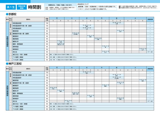 受験対策講座時間割授業形式は、「対面」「映像」があります。「対面」:授業曜日・時間帯は、以下の時間割をご確認ください。「映像」:ご都合にあわせて校舎でご視聴ください。*申込区分について認定制ー「認定(受講資格)」の取得が必要な講座です。どなたでも受講できる講座です。●同一名称の講座は設置校舎・曜日・時間帯が異なっても同一内容です。●担当講師は変更になる場合がありますので、あらかじめご了承ください。授業分数150150150909090909090909090909090授業分数150150150909090909090909090909090月火水木5656565618:40〜21:2018:40〜21:20藤野上村19:50〜21:20大野19:50〜21:20野口(た)・仲19:50〜21:20山本(敏)19:50〜21:20瀬古18:00〜19:30大學19:50〜21:20巽19:50〜21:20木下金5618:40〜21:20土橋19:50〜21:20白井土54映像授業6ーーーーーーーーーーー木下・成川19:50〜21:20山下野村※ご都合にあわせて校舎でご視聴ください。木村・渡部※ご都合にあわせて校舎でご視聴ください。小松・中村※ご都合にあわせて校舎でご視聴ください。月火5656水5618:40〜21:20清水18:00〜19:30中出19:50〜21:20岡内19:50〜21:20畑中・大村19:50〜21:20山崎18:00〜19:30千代野村※ご都合にあわせて校舎でご視聴ください。木村・渡部※ご都合にあわせて校舎でご視聴ください。小松・中村※ご都合にあわせて校舎でご視聴ください。木金56564土5映像授業618:40〜21:20駒井18:40〜21:20山本(敏)19:50〜21:20岸19:50〜21:20藤田19:50〜21:20湘田19:50〜21:20西内-----------木下・成川講座名特別選抜英語特別選抜数学中高一貫(速習)特別選抜数学難関英語難関数学中高一貫(速習)難関数学難関物理難関化学難関・標準国語標準英語標準数学英文法漢文文法・句形(映像)TH物理(映像)TH化学(映像)認定制-認定制--受験対策講座-高1生京都●京都校教科申込区分特別選抜英語特別選抜数学中高一貫(速習)特別選抜数学難関英語難関数学中高一貫(速習)難関数学難関物理難関化学難関・標準国語標準英語標準数学英文法漢文文法・句形(映像)TH物理(映像)TH化学(映像)認定制-認定制---受験対策講座教科申込区分講座名神戸三宮●神戸三宮校1ページ●2024年度/51/近畿/京都/高1生/パターン6614/2024_51_5_531_31_20230824140649.csv20年度51/近/神戸三宮/高1生/パターン6614/2024校了時削除1ージ