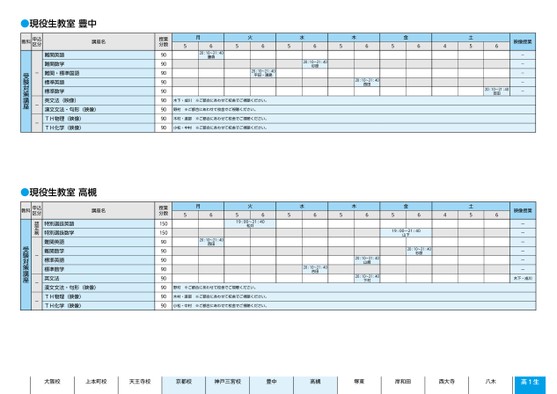月火水木金56565656564土5映像授業620:10〜21:40藤森20:10〜21:40杉原20:10〜21:40平田・瀬島20:10〜21:40西田-----20:10〜21:40吉田木下・成川※ご都合にあわせて校舎でご視聴ください。野村※ご都合にあわせて校舎でご視聴ください。木村・渡部※ご都合にあわせて校舎でご視聴ください。小松・中村※ご都合にあわせて校舎でご視聴ください。月56火5619:00〜21:40松井20:10〜21:40西田野村※ご都合にあわせて校舎でご視聴ください。木村・渡部※ご都合にあわせて校舎でご視聴ください。小松・中村※ご都合にあわせて校舎でご視聴ください。水木金5656564土5映像授業619:00〜21:40山下20:10〜21:40杉原20:10〜21:40吉田20:10〜21:40山崎20:10〜21:40下村ーーーーーー木下・成川授業分数909090909090909090授業分数1501509090909090909090講座名難関英語難関数学難関・標準国語標準英語標準数学英文法(映像)漢文文法・句形(映像)TH物理(映像)TH化学(映像)教科申込区分---受験対策講座豊中●現役生教室豊中高槻教室●現役生教室高槻教科申込区分講座名特別選抜英語特別選抜数学難関英語難関数学標準英語標準数学英文法漢文文法・句形(映像)TH物理(映像)TH化学(映像)認定制---受験対策講座大阪校上本町校天王寺校京都校神戸三宮校豊中高槻堺東岸和田西大寺八木高1生4_51_5_514_31_20230823185821.csv1ページ1ページ●2024年度51/近畿/豊中/高1生/パターン6614/2024_51_5_563_31_20231201153504.csv●2024年度/51/近畿/高槻教室/高1生/パターン6614/2024_51_5_540校了時削除校了時削除