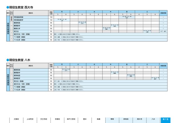 月火水木5656565619:00〜21:40上村20:10〜21:40江川野村※ご都合にあわせて校舎でご視聴ください。木村・渡部※ご都合にあわせて校舎でご視聴ください。小松・中村※ご都合にあわせて校舎でご視聴ください。20:10〜21:40河村18:20〜19:50福井金5619:00〜21:40松井土54映像授業6ーーーーー18:20〜19:50土橋木下・成川月火水木金56565656564土5映像授業620:10〜21:40江川木下・成川※ご都合にあわせて校舎でご視聴ください。野村※ご都合にあわせて校舎でご視聴ください。木村・渡部※ご都合にあわせて校舎でご視聴ください。小松・中村※ご都合にあわせて校舎でご視聴ください。20:10〜21:40信岡20:10〜21:40西田----20:10〜21:40髙戸授業分数15015090909090909090授業分数9090909090909090西大寺●現役生教室西大寺教科申込区分講座名特別選抜英語特別選抜数学難関英語難関数学難関化学英文法漢文文法・句形(映像)TH物理(映像)TH化学(映像)認定制---受験対策講座講座名難関英語難関数学標準英語標準数学英文法(映像)漢文文法・句形(映像)TH物理(映像)TH化学(映像)教科申込区分---受験対策講座八木●現役生教室八木大阪校上本町校天王寺校京都校神戸三宮校豊中高槻堺東岸和田西大寺八木高1生31_20230824091700.csv1ページ校了時削除●2/51/近畿/西大寺/高1生/パターン6614/2024_51_5_535_31_20230823101631.csv●4年度/5近畿八木高1生/パターン6614/2024_51_5_538_31_校了時削除1ージ
