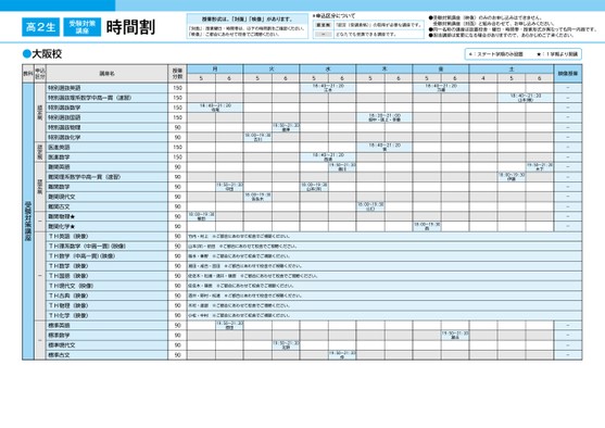 授業分数1501501501509090150150909090授業90分数9015090150901509015090909090901509015090909090909090909090909090909090909090906090909090909090月火5656水5618:40〜21:20江本18:40〜21:20寺尾19:50〜21:20瀧澤18:00〜19:30古川18:40〜21:20西浦19:50〜21:20香川金5618:40〜21:20刀木5618:20〜21:00畑中・阪上・幸重18:40〜21:20慎19:50〜21:20中田月5618:00〜19:30植田火18:00〜19:30佐佐木518:00〜19:30山本(洋)水65618:40〜21:20江本木18:00〜19:305山口6金5618:40〜21:20刀18:00〜19:30西18:20〜21:00畑中・阪上・幸重18:40〜21:20慎18:40〜21:20西浦19:50〜21:20香川18:00〜19:30山本(洋)18:00〜19:30山口19:50〜21:20仲19:50〜21:20瀬古18:00〜19:30西18:40〜21:20竹内・村上寺尾※ご都合にあわせて校舎でご視聴ください。山本(洋)・依田※ご都合にあわせて校舎でご視聴ください。19:50〜21:20鳥本・秦野※ご都合にあわせて校舎でご視聴ください。18:00〜19:30瀧澤湘田・成合・宮田※ご都合にあわせて校舎でご視聴ください。古川佐佐木・松浦・酒井・篠原※ご都合にあわせて校舎でご視聴ください。佐佐木・篠原※ご都合にあわせて校舎でご視聴ください。酒井・野村・松浦※ご都合にあわせて校舎でご視聴ください。木村・渡部小松・中村※ご都合にあわせて校舎でご視聴ください。19:50〜21:20※ご都合にあわせて校舎でご視聴ください。18:00〜19:30中田佐佐木19:50〜21:20原田18:00〜19:30植田19:50〜21:20北野※ご都合にあわせて校舎でご視聴ください。※ご都合にあわせて校舎でご視聴ください。※ご都合にあわせて校舎でご視聴ください。※ご都合にあわせて校舎でご視聴ください。※ご都合にあわせて校舎でご視聴ください。※ご都合にあわせて校舎でご視聴ください。※ご都合にあわせて校舎でご視聴ください。竹内・村上市位・横井山本(洋)・依田清水・永島・成合鳥本・秦野刈谷・中村湘田・成合・宮田井上・上田(善)・一番合戦・菅井佐佐木・松浦・酒井・篠原一番合戦・井上佐佐木・篠原※ご都合にあわせて校舎でご視聴ください。※ご都合にあわせて校舎でご視聴ください。酒井・野村・松浦※ご都合にあわせて校舎でご視聴ください。木村・渡部※ご都合にあわせて校舎でご視聴ください。※ご都合にあわせて校舎でご視聴ください。※ご都合にあわせて校舎でご視聴ください。*:スタート学期のみ設置★:1学期より開講44土5映像授業618:40〜21:20山本(敏)19:50〜21:20木下18:00〜19:30伊藤土5618:40〜21:20山本(敏)19:50〜21:20木下18:00〜19:30伊藤-----------映像授業-----------------------受験対策講座時間割授業形式は、「対面」「映像」があります。「対面」:授業曜日・時間帯は、以下の時間割をご確認ください。「映像」:ご都合にあわせて校舎でご視聴ください。*申込区分について認定制「認定(受講資格)」の取得が必要な講座です。ーどなたでも受講できる講座です。●受験対策講座(映像)のみのお申し込みはできません。受験対策講座(対面)と組み合わせて、お申し込みください。●同一名称の講座は設置校舎・曜日・時間帯・授業形式が異なっても同一内容です。●担当講師は変更になる場合がありますので、あらかじめご了承ください。講座名講座名特別選抜英語特別選抜理系数学中高一貫(速習)特別選抜数学特別選抜国語特別選抜物理特別選抜化学医進英語医進数学難関英語難関理系数学中高一貫(速習)難関数学難関現代文難関古文特別選抜英語難関物理★特別選抜理系数学中高一貫(速習)難関化学★特別選抜数学TH英語(映像)特別選抜国語TH理系数学(中高一貫)映像)特別選抜物理TH数学(中高一貫)映像)特別選抜化学TH数学(映像)医進英語TH国語(映像)医進数学TH現代文(映像)難関英語TH古典(映像)難関理系数学中高一貫(速習)TH物理(映像)難関数学TH化学(映像)難関現代文標準英語難関古文標準数学難関物理★標準現代文難関化学★標準古文TH英語(映像)S英語(映像)TH理系数学(中高一貫)映像)S数学(映像)TH数学(中高一貫)映像)数学ⅠA-知って極める-(映像)TH数学(映像)S国語(映像)TH国語(映像)S現代文(映像)TH現代文(映像)TH古典(映像)TH物理(映像)認定制認定制認定制-認定制認定制-認定制----受験対策講座受験対策講座受験対策講座高2生大阪●大阪校教科申込区分大阪教科申込区分1ページ●2024年度/51/近畿/大阪/高2生/パターン6614/2024_51_5_511_32_20230828181544.csv●2024年度/51/近/大阪高2/パーン64/2024_51_5_511_32_20230828182校了削除1ページ