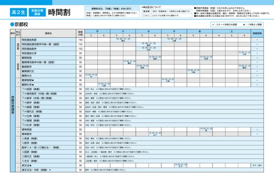 受験対策講座時間割授業形式は、「対面」「映像」があります。「対面」:授業曜日・時間帯は、以下の時間割をご確認ください。「映像」:ご都合にあわせて校舎でご視聴ください。*申込区分について認定制「認定(受講資格)」の取得が必要な講座です。ーどなたでも受講できる講座です。●受験対策講座(映像)のみのお申し込みはできません。受験対策講座(対面)と組み合わせて、お申し込みください。●同一名称の講座は設置校舎・曜日・時間帯・授業形式が異なっても同一内容です。●担当講師は変更になる場合がありますので、あらかじめご了承ください。*:スタート学期のみ設置★:1学期より開講金564土5映像授業6月56火5618:40〜21:20横井木5618:40〜21:20土橋水5618:40〜21:2018:40〜21:20藤田河村19:50〜21:20瀬古18:00〜19:30宮崎18:00〜19:30仲19:50〜21:20大野竹内・村上※ご都合にあわせて校舎でご視聴ください。山本(洋)・依田※ご都合にあわせて校舎でご視聴ください。鳥本・秦野※ご都合にあわせて校舎でご視聴ください。湘田・成合・宮田※ご都合にあわせて校舎でご視聴ください。佐佐木・松浦・酒井・篠原※ご都合にあわせて校舎でご視聴ください。佐佐木・篠原※ご都合にあわせて校舎でご視聴ください。酒井・野村・松浦※ご都合にあわせて校舎でご視聴ください。木村・渡部※ご都合にあわせて校舎でご視聴ください。小松・中村※ご都合にあわせて校舎でご視聴ください。19:50〜21:20堂前19:50〜21:20佐野18:00〜19:30中崎18:00〜19:30大學19:50〜21:20山下19:50〜21:20巽19:50〜21:20小松19:50〜21:20藤田ーーーーーーーーーーーーー市位・横井※ご都合にあわせて校舎でご視聴ください。清水・永島・成合※ご都合にあわせて校舎でご視聴ください。刈谷・中村※ご都合にあわせて校舎でご視聴ください。井上・上田(善)・一番合戦・菅井※ご都合にあわせて校舎でご視聴ください。一番合戦・井上※ご都合にあわせて校舎でご視聴ください。上田(善)・菅井※ご都合にあわせて校舎でご視聴ください。野村※ご都合にあわせて校舎でご視聴ください。19:50〜21:20木下木下・成川授業分数150150150909090909090909090909090909090909090909090609090909090講座名特別選抜英語特別選抜理系数学中高一貫(速習)特別選抜数学特別選抜化学難関英語難関理系数学中高一貫(速習)難関数学難関現代文難関古文難関物理★難関化学★TH英語(映像)TH理系数学(中高一貫)映像)TH数学(中高一貫)映像)TH数学(映像)TH国語(映像)TH現代文(映像)TH古典(映像)TH物理(映像)TH化学(映像)標準英語標準数学S英語(映像)S数学(映像)数学ⅠA-知って極める-(映像)S国語(映像)S現代文(映像)S古文(映像)英文法★漢文文法・句形(映像)*認定制認定制-----受験対策講座高2生京都●京都校教科申込区分1ページ●2024年度/51/近畿/京都/高2生/パターン6614/2024_51_5_531_32_20230828181544.csv校了時削除