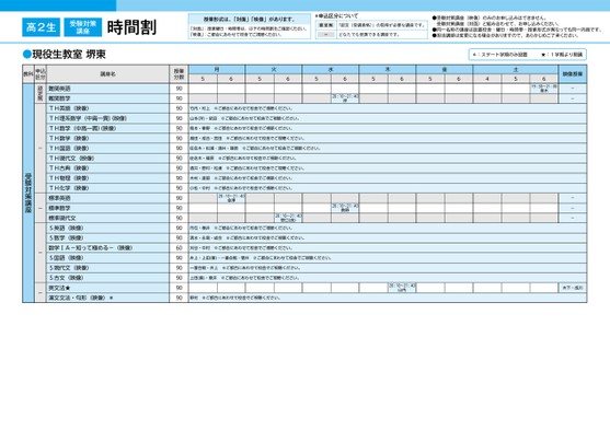 高2生受験対策講座堺東●現役生教室堺東時間割授業形式は、「対面」「映像」があります。「対面」:授業曜日・時間帯は、以下の時間割をご確認ください。「映像」:ご都合にあわせて校舎でご視聴ください。*申込区分について認定制「認定(受講資格)」の取得が必要な講座です。ーどなたでも受講できる講座です。●受験対策講座(映像)のみのお申し込みはできません。受験対策講座(対面)と組み合わせて、お申し込みください。●同一名称の講座は設置校舎・曜日・時間帯・授業形式が異なっても同一内容です。●担当講師は変更になる場合がありますので、あらかじめご了承ください。*:スタート学期のみ設置★:1学期より開講教科申込区分講座名授業分数月火水木金56565656564土5619:30〜21:00青木映像授業-----20:10〜21:40山内木下・成川9090909090909090909090909090909060909090909020:10〜21:40岸20:10〜21:40数野竹内・村上※ご都合にあわせて校舎でご視聴ください。山本(洋)・依田※ご都合にあわせて校舎でご視聴ください。鳥本・秦野※ご都合にあわせて校舎でご視聴ください。湘田・成合・宮田※ご都合にあわせて校舎でご視聴ください。佐佐木・松浦・酒井・篠原※ご都合にあわせて校舎でご視聴ください。佐佐木・篠原※ご都合にあわせて校舎でご視聴ください。酒井・野村・松浦※ご都合にあわせて校舎でご視聴ください。木村・渡部※ご都合にあわせて校舎でご視聴ください。小松・中村※ご都合にあわせて校舎でご視聴ください。20:10〜21:40金澤野口(良)※ご都合にあわせて校舎でご視聴ください。20:10〜21:40市位・横井清水・永島・成合※ご都合にあわせて校舎でご視聴ください。刈谷・中村※ご都合にあわせて校舎でご視聴ください。井上・上田(善)・一番合戦・菅井※ご都合にあわせて校舎でご視聴ください。一番合戦・井上※ご都合にあわせて校舎でご視聴ください。上田(善)・菅井※ご都合にあわせて校舎でご視聴ください。野村※ご都合にあわせて校舎でご視聴ください。難関英語難関数学TH英語(映像)TH理系数学(中高一貫)映像)TH数学(中高一貫)映像)TH数学(映像)TH国語(映像)TH現代文(映像)TH古典(映像)TH物理(映像)TH化学(映像)標準英語標準数学標準現代文S英語(映像)S数学(映像)数学ⅠA-知って極める-(映像)S国語(映像)S現代文(映像)S古文(映像)英文法★漢文文法・句形(映像)*認定制----受験対策講座1ページ●2024年度/51/近畿/堺東/高2生/パターン6614/2024_51_5_533_32_20230828181544.csv校了時削除