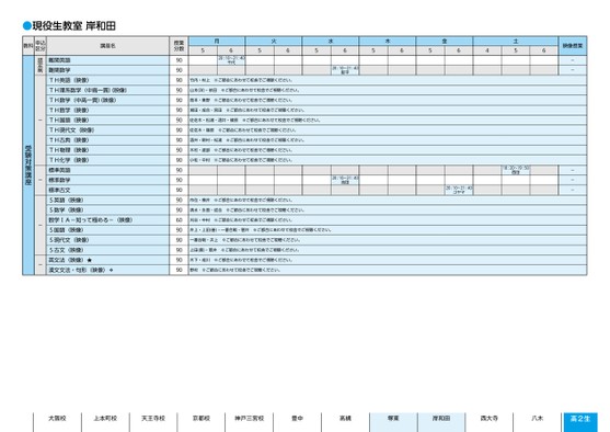 月火水木金56565656564土5映像授業620:10〜21:40千代20:10〜21:40影平竹内・村上※ご都合にあわせて校舎でご視聴ください。山本(洋)・依田※ご都合にあわせて校舎でご視聴ください。鳥本・秦野※ご都合にあわせて校舎でご視聴ください。湘田・成合・宮田※ご都合にあわせて校舎でご視聴ください。佐佐木・松浦・酒井・篠原※ご都合にあわせて校舎でご視聴ください。佐佐木・篠原※ご都合にあわせて校舎でご視聴ください。酒井・野村・松浦※ご都合にあわせて校舎でご視聴ください。木村・渡部※ご都合にあわせて校舎でご視聴ください。小松・中村※ご都合にあわせて校舎でご視聴ください。20:10〜21:40池田18:20〜19:50西田20:10〜21:40コヤマ市位・横井※ご都合にあわせて校舎でご視聴ください。清水・永島・成合※ご都合にあわせて校舎でご視聴ください。刈谷・中村※ご都合にあわせて校舎でご視聴ください。井上・上田(善)・一番合戦・菅井※ご都合にあわせて校舎でご視聴ください。一番合戦・井上※ご都合にあわせて校舎でご視聴ください。上田(善)・菅井※ご都合にあわせて校舎でご視聴ください。木下・成川※ご都合にあわせて校舎でご視聴ください。野村※ご都合にあわせて校舎でご視聴ください。-----授業分数90909090909090909090909090909090609090909090難関英語難関数学TH英語(映像)TH理系数学(中高一貫)映像)TH数学(中高一貫)映像)TH数学(映像)TH国語(映像)TH現代文(映像)TH古典(映像)TH物理(映像)TH化学(映像)標準英語標準数学標準古文S英語(映像)S数学(映像)数学ⅠA-知って極める-(映像)S国語(映像)S現代文(映像)S古文(映像)英文法(映像)★漢文文法・句形(映像)*認定制----受験対策講座岸和田●現役生教室岸和田教科申込区分講座名1ページ●2024年度/51/近畿/岸和田/高2生/パターン6614/2024_51_5_564_32_20230828181544.csv校了時削除大阪校上本町校天王寺校京都校神戸三宮校豊中高槻堺東岸和田西大寺八木高2生