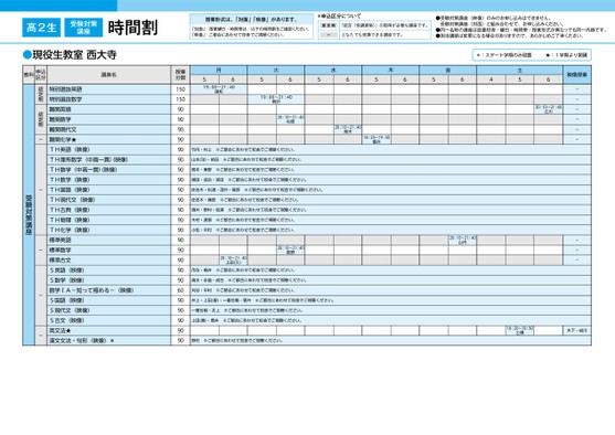 月5619:00〜21:40国松授業分数15015019:00〜21:40駒井20:10〜21:40杉原20:10〜21:40青木18:20〜19:50福井909090909090909090909090909090909090609090909090竹内・村上※ご都合にあわせて校舎でご視聴ください。山本(洋)・依田※ご都合にあわせて校舎でご視聴ください。鳥本・秦野※ご都合にあわせて校舎でご視聴ください。湘田・成合・宮田※ご都合にあわせて校舎でご視聴ください。佐佐木・松浦・酒井・篠原※ご都合にあわせて校舎でご視聴ください。佐佐木・篠原※ご都合にあわせて校舎でご視聴ください。酒井・野村・松浦※ご都合にあわせて校舎でご視聴ください。木村・渡部※ご都合にあわせて校舎でご視聴ください。小松・中村※ご都合にあわせて校舎でご視聴ください。20:10〜21:40数野20:10〜21:40上田(久)市位・横井※ご都合にあわせて校舎でご視聴ください。清水・永島・成合※ご都合にあわせて校舎でご視聴ください。刈谷・中村※ご都合にあわせて校舎でご視聴ください。井上・上田(善)・一番合戦・菅井※ご都合にあわせて校舎でご視聴ください。一番合戦・井上※ご都合にあわせて校舎でご視聴ください。上田(善)・菅井※ご都合にあわせて校舎でご視聴ください。野村※ご都合にあわせて校舎でご視聴ください。20:10〜21:40江川---------18:20〜19:50土橋木下・成川20:10〜21:40山内高2生受験対策講座時間割授業形式は、「対面」「映像」があります。「対面」:授業曜日・時間帯は、以下の時間割をご確認ください。「映像」:ご都合にあわせて校舎でご視聴ください。*申込区分について認定制「認定(受講資格)」の取得が必要な講座です。ーどなたでも受講できる講座です。●受験対策講座(映像)のみのお申し込みはできません。受験対策講座(対面)と組み合わせて、お申し込みください。●同一名称の講座は設置校舎・曜日・時間帯・授業形式が異なっても同一内容です。●担当講師は変更になる場合がありますので、あらかじめご了承ください。火水木金565656564土5映像授業6*:スタート学期のみ設置★:1学期より開講特別選抜英語特別選抜数学難関英語難関数学難関現代文難関化学★TH英語(映像)TH理系数学(中高一貫)映像)TH数学(中高一貫)映像)TH数学(映像)TH国語(映像)TH現代文(映像)TH古典(映像)TH物理(映像)TH化学(映像)標準英語標準数学標準古文S英語(映像)S数学(映像)数学ⅠA-知って極める-(映像)S国語(映像)S現代文(映像)S古文(映像)英文法★漢文文法・句形(映像)*認定制認定制-----受験対策講座教科申込区分講座名西大寺●現役生教室西大寺1ページ●2024年度/51/近畿/西大寺/高2生/パターン6614/2024_51_5_535_32_20231201153504.csv校了時削除
