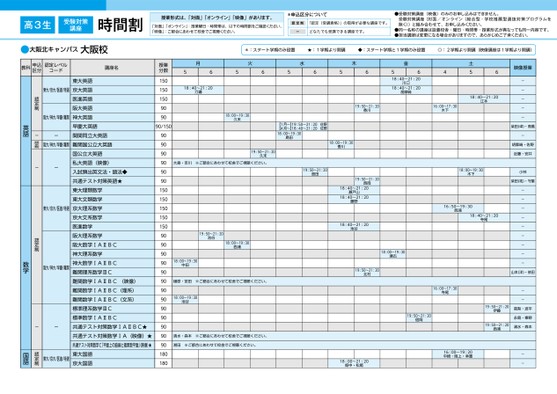 5618:40〜21:20川口18:40〜21:20胡摩﨑19:50〜21:20香川16:00〜17:30木下18:40〜21:20江本18:00〜19:30木下16:50〜19:30西浦18:40〜21:20寺尾-----柴田(卓)・髙橋-胡摩﨑・佐野近藤・安井小林柴田(祐)・守屋---------16:00〜17:30寺尾19:50〜21:20信岡山本(洋)・依田--19:50〜21:20伊藤19:50〜21:20西浦高梨・波平永島・秦野清水・森本18:00〜21:20畑中・松尾16:00〜19:20中崎・阪上・幸重--時間割授業形式は、「対面」「オンライン」「映像」があります。「対面」「オンライン」:授業曜日・時間帯は、以下の時間割をご確認ください。「映像」:ご都合にあわせて校舎でご視聴ください。*申込区分について認定制「認定(受講資格)」の取得が必要な講座です。ーどなたでも受講できる講座です。●受験対策講座(映像)のみのお申し込みはできません。受験対策講座(対面/オンライン〈総合型・学校推薦型選抜対策プログラムを除く〉)と組み合わせて、お申し込みください。●同一名称の講座は設置校舎・曜日・時間帯・授業形式が異なっても同一内容です。●担当講師は変更になる場合がありますので、あらかじめご了承ください。*:スタート学期のみ設置★:1学期より開講◆:スタート学期と1学期のみ設置◎:2学期より開講(映像講座は1学期より開講)月火水木金56565656土54映像授業618:40〜21:20刀18:00〜19:30久末大島・吉川※ご都合にあわせて校舎でご視聴ください。19:50〜21:20久末【1月〜】19:50〜21:20【4月〜】18:40〜21:2018:00〜19:30島田佐野佐野18:00〜19:30香川19:50〜21:20島田19:50〜21:20西岡18:40〜21:20瀬戸山18:40〜21:20藤野18:40〜21:20池谷18:00〜19:30瀬古19:50〜21:20北村19:50〜21:20池谷18:00〜19:30西浦18:00〜19:30中田原・宮田※ご都合にあわせて校舎でご視聴ください。18:00〜19:30池谷清水・森本※ご都合にあわせて校舎でご視聴ください。湘田※ご都合にあわせて校舎でご視聴ください。授業分数150150150909090/15090909090909015015015015015090909090909090909090909090180180東大/京大/医進/特選阪大/神大/早慶/難関-阪大/神大/早慶/難関-東大/京大/医進/特選阪大/神大/早慶/難関-東大/京大/医進/特選東大英語京大英語医進英語阪大英語神大英語早慶大英語関関同立大英語難関国公立大英語国公立大英語私大英語(映像)入試頻出英文法・語法◆共通テスト対策英語★東大理類数学東大文類数学京大理系数学京大文系数学医進数学阪大理系数学阪大数学ⅠAⅡBC神大理系数学神大数学ⅠAⅡBC難関理系数学ⅢC難関数学ⅠAⅡBC(映像)難関数学ⅠAⅡBC(理系)難関数学ⅠAⅡBC(文系)標準理系数学ⅢC標準数学ⅠAⅡBC共通テスト対策数学ⅠAⅡBC★共通テスト対策数学ⅠA(映像)★共通テスト対策数学C「平面上の曲線と複素数平面」映像)★東大国語京大国語認定制-認定制-認定制-認定制英語数学国語教科申込区分認定レベルコード講座名高3生受験対策講座大阪●大阪北キャンパス大阪校1ページ●2024年度/51/近畿/大阪/高3・卒生/パターン6614/2024_51_5_511_11_20230907151827.csv校了時削除