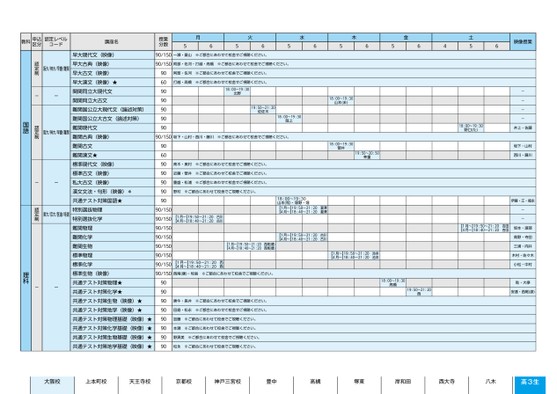 18:00〜19:30山本(ま)18:00〜19:30菅井19:50〜20:50幸重青木・奥村※ご都合にあわせて校舎でご視聴ください。近藤・菅井※ご都合にあわせて校舎でご視聴ください。重盛・松浦※ご都合にあわせて校舎でご視聴ください。野村※ご都合にあわせて校舎でご視聴ください。【1月〜】19:50〜21:20【4月〜】18:40〜21:20古川古川【1月〜】19:50〜21:20【4月〜】18:40〜21:20西尾(健)西尾(健)西西【1月〜】19:50〜21:20【4月〜】18:40〜21:20西尾(健)・牧島※ご都合にあわせて校舎でご視聴ください。唐牛・長井※ご都合にあわせて校舎でご視聴ください。田島・松永※ご都合にあわせて校舎でご視聴ください。加藤※ご都合にあわせて校舎でご視聴ください。本瀬※ご都合にあわせて校舎でご視聴ください。野黒美※ご都合にあわせて校舎でご視聴ください。松永※ご都合にあわせて校舎でご視聴ください。18:00〜19:30山本(和)・塚野・畑【1月〜】19:50〜21:20【4月〜】18:40〜21:20瀧澤瀧澤【1月〜】19:50〜21:20【4月〜】18:40〜21:20古川古川【1月〜】19:50〜21:20【4月〜】18:40〜21:20池本池本18:00〜19:30高橋19:50〜21:20西18:00〜19:30野口(た)【1月〜】19:50〜21:20【4月〜】18:40〜21:20吉田吉田----井上・佐藤坂下・山村西川・藤川伊藤・江・福永--坂本・渡部青野・寺田三浦・向井木村・佐々木小松・中村乾・大學安達・西尾(源)月火水木金56565656564土5映像授業6一瀬・菱山※ご都合にあわせて校舎でご視聴ください。阿部・佐河・打越・髙橋※ご都合にあわせて校舎でご視聴ください。阿部・佐河※ご都合にあわせて校舎でご視聴ください。打越・髙橋※ご都合にあわせて校舎でご視聴ください。18:00〜19:30北野19:50〜21:20佐佐木18:00〜19:30阪上90/150坂下・山村・西川・藤川※ご都合にあわせて校舎でご視聴ください。授業分数90/15090/150906090909090909060909090909090/15090/15090/15090/15090/15090/15090/15090/1509090909090909090講座名早大現代文(映像)早大古典(映像)早大古文(映像)早大漢文(映像)★関関同立大現代文関関同立大古文難関国公立大現代文(論述対策)難関国公立大古文(論述対策)難関現代文難関古典(映像)難関古文難関漢文★標準現代文(映像)標準古文(映像)私大古文(映像)漢文文法・句形(映像)*共通テスト対策国語★特別選抜物理特別選抜化学難関物理難関化学難関生物標準物理標準化学標準生物(映像)共通テスト対策物理★共通テスト対策化学★共通テスト対策生物(映像)★共通テスト対策地学(映像)★共通テスト対策物理基礎(映像)★共通テスト対策化学基礎(映像)★共通テスト対策生物基礎(映像)★共通テスト対策地学基礎(映像)★大阪教科申込区分認定レベルコード阪大/神大/早慶/難関-阪大/神大/早慶/難関-東大/京大/医進/特選認定制-認定制-認定制国語--理科2ページ●2024年度/51/近畿/大阪/高3・卒生/パターン6614/2024_51_5_511_11_20230907151827.csv2校了時削除大阪校上本町校天王寺校京都校神戸三宮校豊中高槻堺東岸和田西大寺八木高3生