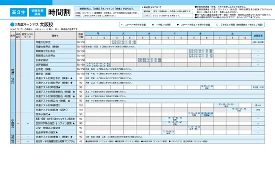 高3生受験対策講座時間割授業形式は、「対面」「オンライン」「映像」があります。「対面」「オンライン」:授業曜日・時間帯は、以下の時間割をご確認ください。「映像」:ご都合にあわせて校舎でご視聴ください。*申込区分について認定制「認定(受講資格)」の取得が必要な講座です。ーどなたでも受講できる講座です。●受験対策講座(映像)のみのお申し込みはできません。受験対策講座(対面/オンライン〈総合型・学校推薦型選抜対策プログラムを除く〉)と組み合わせて、お申し込みください。●同一名称の講座は設置校舎・曜日・時間帯・授業形式が異なっても同一内容です。●担当講師は変更になる場合がありますので、あらかじめご了承ください。*:スタート学期のみ設置★:1学期より開講◆:スタート学期と1学期のみ設置◎:2学期より開講(映像講座は1学期より開講)月5656【1月〜】19:50〜21:20【4月〜】18:40〜21:20小倉小倉※ご都合にあわせて校舎でご視聴ください。坂本(新)・沼田火水木金5656564影山影山【1月〜】19:50〜21:20【4月〜】18:40〜21:20高木高木【1月〜】19:50〜21:20【4月〜】18:40〜21:20【1月〜】19:50〜21:20【4月〜】18:40〜21:20宮本宮本上住上住【1月〜】19:50〜21:20【4月〜】18:40〜21:20田中・西川※ご都合にあわせて校舎でご視聴ください。土56映像授業大内・坂本(勝)----平尾・平松※ご都合にあわせて校舎でご視聴ください。中垣・宮本※ご都合にあわせて校舎でご視聴ください。大野・山口※ご都合にあわせて校舎でご視聴ください。井上※ご都合にあわせて校舎でご視聴ください。松本※ご都合にあわせて校舎でご視聴ください。吉見※ご都合にあわせて校舎でご視聴ください。19:50〜21:20高松中土居・中村17:20〜18:50加賀19:10〜20:40加賀▼17:20〜18:50山本(和)15:50〜18:30河合18:50〜21:30河合佐々木河合-----19:10〜20:4019:10〜20:40加賀伊藤17:20〜18:50神坂小野・加賀・佐藤・山家※ご都合にあわせて校舎でご視聴ください。●出願書類対策(オンライン個別)●面接対策(オンライン個別)●小論文対策(オンライン個別)●【プレミアム】過去問対策(オンライン個別)授業分数90/15090/15090/15090/15090/15090/15090/15090/15090909090909015015090909090909045早慶大日本史早慶大世界史(映像)関関同立大日本史関関同立大世界史日本史論述世界史論述日本史(映像)世界史(映像)共通テスト対策日本史(映像)★共通テスト対策世界史(映像)★共通テスト対策地理★共通テスト対策歴史総合(映像)★共通テスト対策地理総合(映像)★共通テスト対策公共(映像)★共通テスト対策倫理◎共通テスト対策政治・経済◎医系小論文★看護・保健・歯学系小論文(オンライン授業)★自然科学系小論文(オンライン授業)★人文・教育系小論文★社会科学系小論文★共通テスト対策情報Ⅰ(映像)★総合型・学校推薦型選抜対策プログラム--地歴・公民------小論文情報総合教科申込区分認定レベルコード講座名●大阪北キャンパス大阪校大阪※▼のついている講座は、大阪北キャンパス東大・京大・医進館の設置です。4ページ●2024年度/51/近畿/大阪/高3・卒生/パターン6614/2024_51_5_511_11_20230907151827.csv1校了時削除