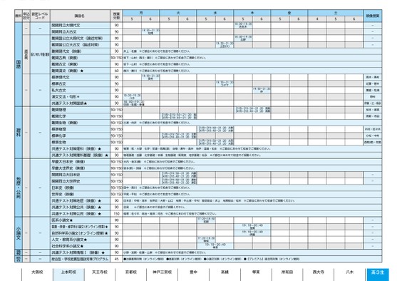 月火水木金56565656564土5映像授業6授業分数909090909019:50〜21:20松尾井上・佐藤※ご都合にあわせて校舎でご視聴ください。18:00〜19:30佐佐木18:00〜19:30北野19:50〜21:20上田(久)大阪校上本町校天王寺校京都校神戸三宮校豊中高槻堺東岸和田西大寺八木90/150坂下・山村・西川・藤川※ご都合にあわせて校舎でご視聴ください。90609090909090坂下・山村※ご都合にあわせて校舎でご視聴ください。西川・藤川※ご都合にあわせて校舎でご視聴ください。19:50〜21:20奥村18:00〜19:30八木18:00〜19:30中田・松尾・幸重90/15090/15090/150三浦・向井【1月〜】19:50〜21:20【4月〜】18:40〜21:20※ご都合にあわせて校舎でご視聴ください。西西19:50〜21:20コヤマ19:50〜21:20仲【1月〜】19:50〜21:20【4月〜】18:40〜21:20高橋高橋90/15090/15090/150909090/15090/15090/15090/15090/15090/15090901509090授業分数9090909045【1月〜】19:50〜21:20【4月〜】18:40〜21:20北野北野【1月〜】19:50〜21:20【4月〜】18:40〜21:20大學大學【1月〜】19:50〜21:20【4月〜】18:40〜21:20大西大西物理:乾・大學化学:安達・西尾(源)生物:唐牛・長井地学:田島・松永※ご都合にあわせて校舎でご視聴ください。物理基礎:加藤化学基礎:本瀬生物基礎:野黒美地学基礎:松永※ご都合にあわせて校舎でご視聴ください。大内・坂本(勝)※ご都合にあわせて校舎でご視聴ください。坂本(新)・沼田※ご都合にあわせて校舎でご視聴ください。内藤内藤澤田澤田【1月〜】19:50〜21:20【4月〜】18:40〜21:20【1月〜】19:50〜21:20【4月〜】18:40〜21:20田中・西川※ご都合にあわせて校舎でご視聴ください。平尾・平松※ご都合にあわせて校舎でご視聴ください。日本史:中垣・宮本世界史:大野・山口地理:中土居・中村歴史総合:井上地理総合:松本※ご都合にあわせて校舎でご視聴ください。吉見※ご都合にあわせて校舎でご視聴ください。倫理:佐々木政治・経済:河合※ご都合にあわせて校舎でご視聴ください。月火17:20〜18:50加賀水56565617:20〜18:50神坂19:10〜20:40神坂19:10〜20:40木加賀19:10〜20:4056伊藤金564土56小野・加賀・佐藤・山家※ご都合にあわせて校舎でご視聴ください。●出願書類対策(オンライン個別)●面接対策(オンライン個別)●小論文対策(オンライン個別)●【プレミアム】過去問対策(オンライン個別)----青木・奥村近藤・菅井重盛・松浦野村伊藤・江・福永坂本・渡部青野・寺田木村・佐々木小松・中村西尾(健)・牧島---映像授業----高3生講座名関関同立大現代文関関同立大古文難関国公立大現代文(論述対策)難関国公立大古文(論述対策)難関現代文(映像)難関古典(映像)難関古文(映像)難関漢文(映像)★標準現代文標準古文私大古文漢文文法・句形*共通テスト対策国語★難関物理難関化学難関生物(映像)標準物理標準化学標準生物共通テスト対策理科(映像)★共通テスト対策理科基礎(映像)★早慶大日本史(映像)早慶大世界史(映像)関関同立大日本史関関同立大世界史日本史(映像)世界史(映像)共通テスト対策地歴(映像)★共通テスト対策公共(映像)★共通テスト対策公民(映像)★医系小論文★看護・保健・歯学系小論文(オンライン授業)★自然科学系小論文(オンライン授業)★人文・教育系小論文★社会科学系小論文★共通テスト対策情報Ⅰ(映像)★総合型・学校推薦型選抜対策プログラム講座名上本町教科申込区分認定レベルコード-阪大/神大/早慶/難関-認定制国語----理科--地歴・公民上本町小論文小論文情報総合-認定レベルコード---教科申込区分小論文------ージ●2024年度/51/近畿/上本町/高3・卒生/パターン6614/2024_51_5_513_11_20240401143932.csv4ページ校了時削除●2024年度/51/近畿/上本町/