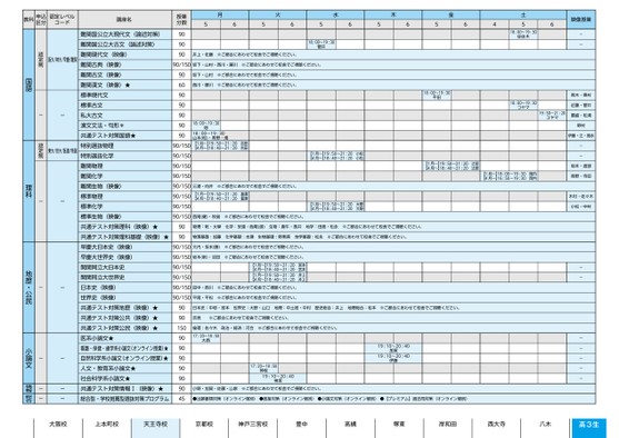 国語認定制認定レベル阪大/神大/早慶/難関認定レベル看護・保健・歯学系小論文(オンライン授業)★共通テスト対策公共(映像)★共通テスト対策地歴(映像)★看護・保健・歯学系小論文(オンライン授業)★共通テスト対策公民(映像)★共通テスト対策公共(映像)★共通テスト対策地歴(映像)★日本史(映像)関関同立大世界史関関同立大日本史早慶大日本史(映像)共通テスト対策理科基礎(映像)★共通テスト対策理科(映像)★標準化学標準物理難関生物(映像)難関化学特別選抜化学特別選抜物理共通テスト対策国語★私大古文標準古文標準現代文難関古文(映像)難関古典(映像)難関現代文(映像)総合型・学校推薦型選抜対策プログラム社会科学系小論文★人文・教育系小論文★然科学小論文(オンライ授業)★共通テスト対策公民(映像)★標準生物(映像)科(映像)★難関化学(映像)難関国公立大現代文(論述対策)難関国公立大古文(論述対策)関関同立大古文講座名講座名関関同立大古文代文(論述対策)難関漢文(映像)★難関国公立大現代文(論述対策)難関国公立大古文(論述対策)難関国公立大古文(論述対策)難関現代文(映像)難関現代文(映像)難関古典(映像)漢文文法・句形*難関古文(映像)★難関漢文(映像)★標準現代文標準古文難関物理私大古文・句形*漢文文法・句形*語★共通テスト対策国語★特別選抜物理特別選抜化学標準生物(映像)難関物理難関生物(映像)標準物理標準物理標準化学早慶大世界史(映像)標準化学(映像)共通テスト対策理科(映像)★)★共通テスト対策理科基礎(映像)★世界史(映像)早慶大日本史(映像)早慶大世界史(映像)関関同立大日本史関関同立大世界史医系小論文★日本史(映像)世界史(映像)地歴(映像)★医系小論文★看護・保健・歯学系小論文(オンライン授業)★共通テスト対策情報Ⅰ(映像)★佐佐木9090授業分数分数授業9018:00〜19:30菅井-井上・佐藤月※ご都合にあわせて校舎でご視聴ください。月90/150坂下・山村・西川・藤川6※ご都合にあわせて校舎でご視聴ください。5909090909060909090909060909090坂下・山村※ご都合にあわせて校舎でご視聴ください。井上・佐藤西川・藤川※ご都合にあわせて校舎でご視聴ください。※ご都合にあわせて校舎でご視聴ください。--18:00〜19:30平田青木・奥村18:00〜19:30コヤマ近藤・菅井19:50〜21:20コヤマ重盛・松浦18:00〜19:30下・山村畑野村山本(和)・青野・畑【1月〜】19:50〜21:2018:00〜19:30西川・藤川【4月〜】18:40〜21:20伊藤・江・福永理科認定制東大/京大/医進/特選90/150吉田吉田-90/150【1月〜】19:50〜21:20【4月〜】18:40〜21:20小松小松---90/150【1月〜】19:50〜21:20【4月〜】18:40〜21:20辻居辻居坂本・渡部重盛・松浦90/15090/15090/15090/15090/15090/15090/15090/15090/15090/150【4月〜】16:50〜19:30【1月〜】18:00〜19:30岡内岡内青野・寺田三浦・向井18:00〜19:3018:00〜19:30【1月〜】19:50〜21:20和)・青野・畑【1月〜】19:50〜21:20【1月〜1:50〜21:20【月〜18:0〜1:20【4月〜】18:40〜21:20【4月〜】18:40〜21:20山本(和)・青野・畑8:0〜1930※都合にあわせて校舎でご視聴ください。瀧澤吉田吉田瀧澤吉田吉田木村・佐々木【1月〜】19:50〜21:20【1月〜】19:50〜21:20【4月〜】18:40〜21:20【4月〜】18:40〜21:20【1月〜】19:50〜21:20【4月〜】18:40〜21:20大野小松小松大野小松小松小松・中村坂本・渡部坂本・渡部西尾(健)・牧島大内・坂本(勝)物理基礎:加藤物理:乾・大學坂本(新)・沼田西尾(健)・牧島【1月〜】19:50〜21:20三浦・向井三浦・向井西尾(健)・牧島【1月〜】19:50〜21:20【月〜】18:40〜21:20【4月〜】18:40〜21:20乾・大學※ご都合にあわせて校舎でご視聴ください。90化学:安達・西尾(源)生物:唐牛・長井地学:田島・松永※ご都合にあわせて校舎でご視聴ください。90化学基礎:本瀬生物基礎:野黒美地学基礎:松永※ご都合にあわせて校舎でご視聴ください。地歴・公民--90/15090/15090/15090/15090/15090/150化学基礎:本瀬※ご都合にあわせて校舎でご視聴ください。※ご都合にあわせて校舎でご視聴ください。※ご都合にあわせて校舎でご視聴ください。井上宮本宮※ご都合にあわせて校舎でご視聴ください。※ご都合にあわせて校舎でご視聴ください。化学:安達・西尾(源)井上【1月〜】19:50〜21:20【4月〜】18:40〜21:20【1】1:50〜21:20【4月〜】18:40〜21:20-90/15090/15090/15090/15090/15090/150-田中・西川日本史:中垣・宮本坂本(新)・沼田平尾・平松大内・坂本(勝)物理基礎:加藤大内・坂本(勝)坂本(新)・沼田※ご都合にあわせて校舎でご視聴ください。※ご都合にあわせて校舎でご視聴ください。90世界史:大野・山口地理:中土居・中村歴史総合:井上地理総合:松本※ご都合にあわせて校舎でご視聴ください。90倫理:佐々木吉見17:20〜18:50田中・西川田中・西川※ご都合にあわせて校舎でご視聴ください。150政治・経済:河合※ご都合にあわせて校舎でご視聴ください。小論文地歴・公------90909090大西-19:10〜20:40加賀-/51/近畿/天王寺/高3・卒生/パターン6614/2024_51_5_515_11_20230907145739.csv校了時削除●2024年度/51/近畿/天王寺/高3・卒生パター6614/2024_51_5_5_11202309074573.csv天王寺-区分教科申込-区分教科申込コードコード火火水水木木