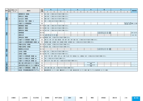 月火水木金56565656564土5映像授業6青木・奥村※ご都合にあわせて校舎でご視聴ください。近藤・菅井※ご都合にあわせて校舎でご視聴ください。重盛・松浦※ご都合にあわせて校舎でご視聴ください。野村※ご都合にあわせて校舎でご視聴ください。坂本・渡部※ご都合にあわせて校舎でご視聴ください。青野・寺田※ご都合にあわせて校舎でご視聴ください。三浦・向井※ご都合にあわせて校舎でご視聴ください。20:10〜21:40野口(良)・堀伊藤・江・福永北山北山【1月〜】20:10〜21:40【4月〜】19:00〜21:40吉田吉田木村・佐々木小松・中村【1月〜】20:10〜21:40【4月〜】19:00〜21:40西尾(健)・牧島※ご都合にあわせて校舎でご視聴ください。物理:乾・大學化学:安達・西尾(源)生物:唐牛・長井地学:田島・松永※ご都合にあわせて校舎でご視聴ください。物理基礎:加藤化学基礎:本瀬生物基礎:野黒美地学基礎:松永※ご都合にあわせて校舎でご視聴ください。大内・坂本(勝)※ご都合にあわせて校舎でご視聴ください。坂本(新)・沼田※ご都合にあわせて校舎でご視聴ください。田中・西川※ご都合にあわせて校舎でご視聴ください。平尾・平松※ご都合にあわせて校舎でご視聴ください。【1月〜】20:10〜21:40【4月〜】19:00〜21:40玉城玉城日本史:中垣・宮本世界史:大野・山口地理:中土居・中村歴史総合:井上地理総合:松本※ご都合にあわせて校舎でご視聴ください。吉見※ご都合にあわせて校舎でご視聴ください。倫理:佐々木政治・経済:河合※ご都合にあわせて校舎でご視聴ください。小野・加賀・佐藤・山家※ご都合にあわせて校舎でご視聴ください。●出願書類対策(オンライン個別)●面接対策(オンライン個別)●小論文対策(オンライン個別)●【プレミアム】過去問対策(オンライン個別)19:10〜20:4019:10〜20:40加賀伊藤---講座名標準現代文(映像)標準古文(映像)私大古文(映像)漢文文法・句形(映像)*共通テスト対策国語★難関物理(映像)難関化学(映像)難関生物(映像)標準物理標準化学標準生物(映像)共通テスト対策理科(映像)★共通テスト対策理科基礎(映像)★早慶大日本史(映像)早慶大世界史(映像)関関同立大日本史日本史(映像)世界史(映像)共通テスト対策地歴(映像)★共通テスト対策公共(映像)★共通テスト対策公民(映像)★看護・保健・歯学系小論文(オンライン授業)★自然科学系小論文(オンライン授業)★共通テスト対策情報Ⅰ(映像)★総合型・学校推薦型選抜対策プログラム授業分数909090909090/15090/15090/15090/15090/15090/150909090/15090/15090/15090/15090/150909015090909045豊中教科申込区分認定レベルコード------------国語理科地歴・公民小論文情報総合2ページ●2024年度/51/近畿/豊中/高3・卒生/パターン6614/2024_51_5_563_11_20230907145739.csv校了時削除大阪校上本町校天王寺校京都校神戸三宮校豊中高槻堺東岸和田西大寺八木高3生