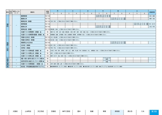 月火水木金56565656564土56【1月〜】20:10〜21:40【4月〜】19:00〜21:40乾乾【1月〜】20:10〜21:40【4月〜】19:00〜21:40北野北野三浦・向井※ご都合にあわせて校舎でご視聴ください。西尾(健)・牧島※ご都合にあわせて校舎でご視聴ください。物理:乾・大學化学:安達・西尾(源)生物:唐牛・長井地学:田島・松永※ご都合にあわせて校舎でご視聴ください。物理基礎:加藤化学基礎:本瀬生物基礎:野黒美地学基礎:松永※ご都合にあわせて校舎でご視聴ください。【1月〜】20:10〜21:40【4月〜】19:00〜21:40大野大野【1月〜】20:10〜21:40【4月〜】19:00〜21:40大學大學大内・坂本(勝)※ご都合にあわせて校舎でご視聴ください。坂本(新)・沼田※ご都合にあわせて校舎でご視聴ください。田中・西川※ご都合にあわせて校舎でご視聴ください。平尾・平松※ご都合にあわせて校舎でご視聴ください。【1月〜】20:10〜21:40【4月〜】19:00〜21:40中田中田日本史:中垣・宮本世界史:大野・山口地理:中土居・中村歴史総合:井上地理総合:松本※ご都合にあわせて校舎でご視聴ください。吉見※ご都合にあわせて校舎でご視聴ください。倫理:佐々木政治・経済:河合※ご都合にあわせて校舎でご視聴ください。小野・加賀・佐藤・山家※ご都合にあわせて校舎でご視聴ください。●出願書類対策(オンライン個別)●面接対策(オンライン個別)●小論文対策(オンライン個別)●【プレミアム】過去問対策(オンライン個別)19:10〜20:4019:10〜20:40加賀伊藤映像授業坂本・渡部青野・寺田木村・佐々木小松・中村---講座名難関物理難関化学難関生物(映像)標準物理標準化学標準生物(映像)共通テスト対策理科(映像)★共通テスト対策理科基礎(映像)★早慶大日本史(映像)早慶大世界史(映像)関関同立大日本史日本史(映像)世界史(映像)共通テスト対策地歴(映像)★共通テスト対策公共(映像)★共通テスト対策公民(映像)★看護・保健・歯学系小論文(オンライン授業)★自然科学系小論文(オンライン授業)★共通テスト対策情報Ⅰ(映像)★総合型・学校推薦型選抜対策プログラム授業分数90/15090/15090/15090/15090/15090/150909090/15090/15090/15090/15090/150909015090909045岸和田教科申込区分認定レベルコード--理科--------地歴・公民小論文情報総合3ページ●2024年度/51/近畿/岸和田/高3・卒生/パターン6614/2024_51_5_564_11_20230907145739.csv校了時削除大阪校上本町校天王寺校京都校神戸三宮校豊中高槻堺東岸和田西大寺八木高3生