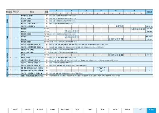 月火水木金56565656564土5映像授業6青木・奥村※ご都合にあわせて校舎でご視聴ください。近藤・菅井※ご都合にあわせて校舎でご視聴ください。重盛・松浦※ご都合にあわせて校舎でご視聴ください。野村※ご都合にあわせて校舎でご視聴ください。【1月〜】20:10〜21:40【4月〜】19:00〜21:40本瀬本瀬三浦・向井※ご都合にあわせて校舎でご視聴ください。【1月〜】20:10〜21:40【4月〜】19:00〜21:40大學大學西尾(健)・牧島※ご都合にあわせて校舎でご視聴ください。20:10〜21:40野口(良)・山本(ま)【1月〜】20:10〜21:40【4月〜】19:00〜21:40植田植田【1月〜】20:10〜21:40【4月〜】19:00〜21:40大野大野伊藤・江・福永坂本・渡部青野・寺田木村・佐々木小松・中村物理:乾・大學化学:安達・西尾(源)生物:唐牛・長井地学:田島・松永※ご都合にあわせて校舎でご視聴ください。物理基礎:加藤化学基礎:本瀬生物基礎:野黒美地学基礎:松永※ご都合にあわせて校舎でご視聴ください。大内・坂本(勝)※ご都合にあわせて校舎でご視聴ください。坂本(新)・沼田※ご都合にあわせて校舎でご視聴ください。平尾・平松※ご都合にあわせて校舎でご視聴ください。【1月〜】20:10〜21:40【4月〜】19:00〜21:40高木高木田中・西川日本史:中垣・宮本世界史:大野・山口地理:中土居・中村歴史総合:井上地理総合:松本※ご都合にあわせて校舎でご視聴ください。吉見※ご都合にあわせて校舎でご視聴ください。倫理:佐々木政治・経済:河合※ご都合にあわせて校舎でご視聴ください。19:10〜20:4019:10〜20:40加賀伊藤--小野・加賀・佐藤・山家※ご都合にあわせて校舎でご視聴ください。●出願書類対策(オンライン個別)●面接対策(オンライン個別)●小論文対策(オンライン個別)●【プレミアム】過去問対策(オンライン個別)講座名標準現代文(映像)標準古文(映像)私大古文(映像)漢文文法・句形(映像)*共通テスト対策国語★難関物理難関化学難関生物(映像)標準物理標準化学標準生物(映像)共通テスト対策理科(映像)★共通テスト対策理科基礎(映像)★早慶大日本史(映像)早慶大世界史(映像)日本史世界史(映像)共通テスト対策地歴(映像)★共通テスト対策公共(映像)★共通テスト対策公民(映像)★看護・保健・歯学系小論文(オンライン授業)★自然科学系小論文(オンライン授業)★共通テスト対策情報Ⅰ(映像)★総合型・学校推薦型選抜対策プログラム授業分数909090909090/15090/15090/15090/15090/15090/150909090/15090/15090/15090/150909015090909045八木教科申込区分認定レベルコード------------国語理科地歴・公民小論文情報総合2ページ●2024年度/51/近畿/八木/高3生/パターン6614/2024_51_5_538_11_20230907145739.csv校了時削除大阪校上本町校天王寺校京都校神戸三宮校豊中高槻堺東岸和田西大寺八木高3生