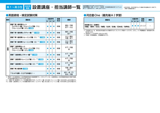 高1〜高3生目的別講座設置講座・担当講師一覧目的別講座のみのお申し込みはできません。受験対策講座(対面/オンライン〈総合型・学校推薦型選抜対策プログラムを除く〉)と組み合わせて、お申し込みください。*2023年度・2022年度のセレクト講座の同名講座と同一内容です。(英検対策講座を除く)●河合塾One(最先端AⅠ学習)講座名対象学年高1高2高3授業形式講師河合塾One(全教科)「英語」「数学」「古文」「物理」「化学」「生物」「日本史」「世界史」●●●e-ラーニング-*「河合塾One」は、株式会社河合塾Oneが提供するAⅠオンライン学習サービスです。ただし、AⅠ学習機能は一部対象外の科目があります。全科目セットでのお申し込みとなります。**「生物」の学習範囲は、生物基礎のみです。講師横井・守屋宮下・小山横井・守屋宮下小山・横井守屋・宮下小山・横井守屋・宮下木下・守屋堤木下・守屋堤木下・守屋堤木下・守屋堤守屋・横井宮下成川・森(千)安井・守屋対象学年高1高2高3授業形式●●●映像●●●●●●●●●映像映像映像●●●映像●●●●●●●●●●●●●●●映像映像映像映像映像英検®準1級対策セット「レクチャー編」「トレーニング編(1)」「トレーニング編(2)」4月開講英検®準1級対策レクチャー編※14月開講英検®準1級対策トレーニング編(1)※14月開講英検®準1級対策トレーニング編(2)※14月開講英検®2級対策トレーニング編(1)※24月開講英検®2級対策トレーニング編(2)※24月開講英検®準2級対策4月開講TEAP対策-スコア200超え!-英検®2級対策セット「レクチャー編」「トレーニング編(1)」「トレーニング編(2)」4月開講英語英検®2級対策レクチャー編※24月開講●英語資格・検定試験対策教科講座名*「英検®」は公益財団法人日本英語検定協会の登録商標です。このコンテンツは、公益財団法人日本英語検定協会の承認や推奨、その他の検討を受けたものではありません。※1「英検®準1級対策セット」での受講が基本ですが、「レクチャー編」または各「トレーニング編」のみのお申し込みも可能です。※2「英検®2級対策セット」での受講が基本ですが、「レクチャー編」または各「トレーニング編」のみのお申し込みも可能です。