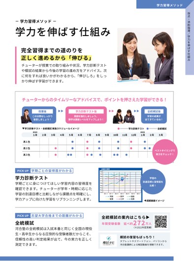 採点・添削指導/学力を伸ばす仕組み学力習得メソッド-学力習得メソッド-学力を伸ばす仕組み完全習得までの道のりを正しく進めるから「伸びる」チューターが授業での取り組みや状況、学力診断テストや模試の結果から今後の学習の進め方をアドバイス。次に何をすれば良いかがわかるから、「伸びしろ」をしっかり伸ばす学習ができます。チューターからのタイムリーなアドバイスで、ポイントを押さえた学習ができる!授業後この分野はしっかり復習しましょう!▶▶学力診断テスト後英語を強化しましょう。数学は講座レベルをアップしよう!▶▶▶▶全統模試後学習の成果が出てきているね!●………学力診断テスト●………全統模試��月��月��月2月3月����1月●●●ベストタイミングで実力をチェック!●●●●●●●成績の推移7月8月9月●●●●●●●▶学力診断テスト・全統模試実施スケジュールイメージ1月����2月3月4月5月6月●●●●●●高1生高2生高3生PICKUP学期ごとの習得度がわかる学力診断テスト学期ごとに身につけてほしい学習内容の習得度を確認できます。チューターが学年・時期に応じた学習の到達目標と比較しながら課題点を明確にし、学力アップに向けた学習をリプランニングします。P90P85P80P75P70P65P60P55P50P45到達目標と習得度を学習の比較!▼成績画面イメージ高2③高1①高1②英語物理高2④数学化学高2⑤高3⑥国語地理高3⑦PICKUP志望大学合格までの距離がわかる全統模試河合塾の全統模試は入試本番と同じく全国の現役生・高卒生からなる圧倒的な受験者数だからこそ、信頼性の高い判定結果が出て、今の実力を正しく測定できます。全統模試の案内はこちら▶年間受験者数延べ約���万人(※����年度実績)模試の復習もばっちり!タブレットやスマートフォン、パソコンから河合塾講師による解説動画を視聴できます。