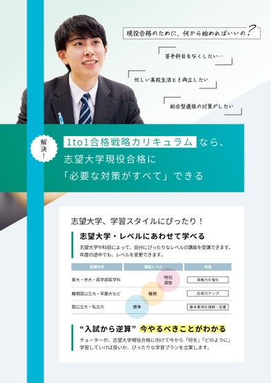 現役合格のために、何から始めればいいの?苦手科目をなくしたい…忙しい高校生活とも両立したい総合型選抜の対策がしたい�to�合格戦略カリキュラムなら、志望大学現役合格に「必要な対策がすべて」できる解決!志望大学、学習スタイルにぴったり!志望大学・レベルにあわせて学べる志望大学や科目によって、自分にぴったりなレベルの講座を受講できます。年度の途中でも、レベルを変更できます。講座レベル目標大学特長東大・京大・医学部医学科難関国公立大・早慶大など国公立大・私立大難関標準特別選抜実戦力を強化応用力アップ基本事項を理解・定着“入試から逆算”今やるべきことがわかるチューターが、志望大学現役合格に向けて今から「何を」「どのように」学習していけば良いか、ぴったりな学習プランを立案します。