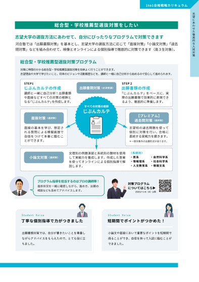 �to�合格戦略カリキュラム志望にあわせた徹底的な入試対策総合型・学校推薦型選抜対策をしたい志望大学の選抜方法にあわせて、自分にぴったりなプログラムで対策できます河合塾では「出願書類対策」を基本とし、志望大学の選抜方法に応じて「面接対策」「小論文対策」「過去問対策」などを組み合わせて、映像とオンラインによる個別指導で徹底的に対策できます(高3生対象)。総合型・学校推薦型選抜対策プログラム対策に時間のかかる総合型・学校推薦型選抜対策を効率よく行うことができます。志望理由や大学で学びたいこと、将来のビジョンや活動履歴などを、講師と一緒に自己分析から始めるので安心して進められます。STEP�じぶんカルテの作成講師と一緒に自己分析!出願書類や面接などすべての対策の根幹となる「じぶんカルテ」を作成します。面接対策(選択制)面接の基本を学び、想定される質問による模擬面接で自信をつけて本番に臨むことができます。小論文対策(選択制)出願書類対策(必須受講)すべての対策の根幹じぶんカルテSTEP2出願書類の作成「じぶんカルテ」をベースに、実際の出願書類で効果的に表現できるよう、徹底的に準備します。【プレミアム】過去問対策(選択制)志望校の過去問題を使って個別に対策を行い、合格に直結する実戦力を磨きます。*一部対象外の出題形式があります。文理別の例題演習と系統別の題材を使用して実戦力を養成します。作成した答案を使ってオンラインによる個別指導で解説します。〈系統別〉・医系・情報理系・人文教育系・自然科学系・社会科学系・情報文系プログラム指導を担当するのはプロの講師陣!進捗状況を一緒に確認しながら、進め方、出願の相談なども含めてアドバイスします。対策プログラムについてはこちら▶2023/11/8(水)公開StudentVoice丁寧な個別指導で力がつきましたStudentVoice短期間でポイントがつかめた!出願書類対策では、自分が書きたいことを尊重しながらアドバイスをもらえたので、とても役に立小論文や面接において重要なポイントを短期間で得ることができ、自信を持って入試に臨むことがちました。できました。
