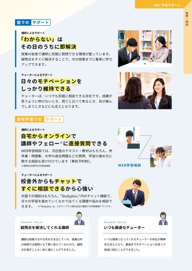 質問・相談���°学習サポートWEB学習相談講師によるサポートサポート塾での「わからない」はその日のうちに即解決授業の前後で講師に気軽に質問できる環境が整っています。疑問点をすぐに解決することで、次の授業までに着実に学力アップできます。チューターによるサポート日々のモチベーションをしっかり維持できるチューターは、いつでも気軽に相談できる存在です。成績が思うように伸びないとき、周りと比べて焦るとき、気が緩んでしまうときなどにも支えとなります。講師によるサポートサポート自宅学習での自宅からオンラインで講師やフェロー※に直接質問できるWEB学習相談では、河合塾のテキスト・教材はもちろん、参考書・問題集、大学の過去問題などの質問、学習の進め方に関する相談も受け付けています(事前予約制)。※質問対応専門の学習指導員チューターによるサポート校舎外からもチャットですぐに相談できるから心強い対面での相談はもちろん、「Studyplus」※内のチャット機能で、日々の学習を進めていくなかで出てくる課題や悩みを相談できます。※「Studyplus」は、スタディプラス株式会社が運営する学習管理アプリです。StudentVoice疑問点を解決してくれる講師StudentVoiceいつも親身なチューター講師は授業ではやる気を引き出してくれ、授業以外の時間では質問にも丁寧に答えてくれたので、疑問点を残すことなく前に進むことができました。いつも親身になってくれるチューターの存在が精神的な支えとなり、最後までモチベーションを保って勉強に励むことができました。