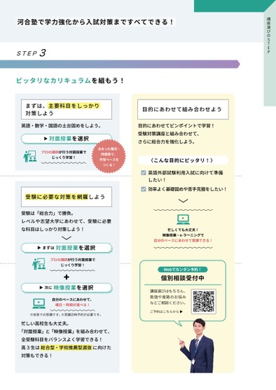 講座選びのSTEP河合塾で学力強化から入試対策まですべてできる!STEP3ピッタリなカリキュラムを組もう!目的にあわせて組み合わせよう目的にあわせてピンポイントで学習!受験対策講座と組み合わせて、さらに総合力を強化しよう。〈こんな目的にピッタリ!〉英語外部試験利用入試に向けて準備したい!効率よく基礎固めや苦手克服をしたい!忙しくても大丈夫!映像授業・e-ラーニングで自分のペースにあわせて受講できる!Webでカンタン予約!個別相談受付中講座選びはもちろん、勉強や進路のお悩みなどご相談ください。ご予約はこちらから▶まずは、主要科目をしっかり対策しよう英語・数学・国語の土台固めをしよう。決まった曜日・時間帯で、学習ペースをつくる!▶対面授業を選択プロの講師が行う対面授業でじっくり学習!受験に必要な対策を網羅しよう受験は「総合力」で勝負。レベルや志望大学にあわせて、受験に必要な科目はしっかり対策しよう!▶まずは対面授業を選択プロの講師が行う対面授業でじっくり学習!▶次に映像授業を選択自分のペースにあわせて、曜日・時間が選べる!※校舎での受講です。※受講日時予約が必要です。忙しい高校生も大丈夫。「対面授業」と「映像授業」を組み合わせて、全受験科目をバランスよく学習できる!高3生は総合型・学校推薦型選抜に向けた対策もできる!