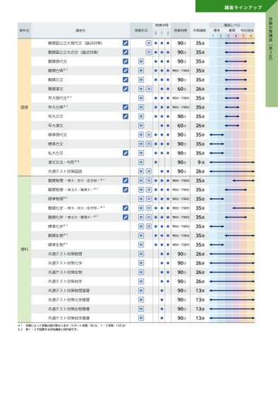 受験対策講座﹇高3生﹈講座ラインアップ授業形式開講学期ス12授業時間年間講数標準難関1234特別選抜56講座レベル●●●●●●●●●●●●●●●●●●●●●●●●●●●●●●●●●●●●●●●●●●●●●●●●●●●●●●●●●●●●●●●●●●●●●●●●●●●●90分90分90分90分/150分90分60分90分/150分90分/150分90分60分90分90分90分90分90分90分/150分90分/150分90分/150分90分/150分90分/150分90分/150分90分/150分90分/150分90分90分90分90分90分90分90分90分35講35講35講35講35講26講35講35講35講26講35講35講35講9講26講35講35講35講35講35講35講35講35講26講26講26講26講13講13講13講13講教科名講座名難関国公立大現代文(論述対策)難関国公立大古文(論述対策)国語理科難関現代文難関古典※1難関古文難関漢文早大現代文※1早大古典※1早大古文早大漢文標準現代文標準古文私大古文漢文文法・句形※2共通テスト対策国語難関物理-東大・京大・医学部-※1難関物理-東北大・難関大-※1標準物理※1難関化学-東大・京大・医学部-※1難関化学-東北大・難関大-※1標準化学※1難関生物※1標準生物※1共通テスト対策物理共通テスト対策化学共通テスト対策生物共通テスト対策地学共通テスト対策物理基礎共通テスト対策化学基礎共通テスト対策生物基礎共通テスト対策地学基礎※1学期によって授業分数が異なります(スタート学期:90分、1・2学期:150分)※2高1・2で設置する同名講座と同内容です。