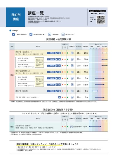 講座一覧目的別講座のみのお申し込みはできません。受験対策講座(対面/オンライン総合型・学校推薦型選抜対策プログラムを除く〉)と組み合わせて、お申し込みください。2023年度、2022年度のセレクト講座の同名講座と同一内容です。(英検®対策講座を除く)Webサイトへアクセス!講座を探す・申し込む2023/11/8(水)公開目的別講座●マーク授業形式授業時間年間講数標準難関1234特別選抜56講座レベル90分20講90分10講90分各5講90分15講90分5講90分各5講90分90分5講5講対象学年高3高2高1●●●●●●●●●●●●●●●●●●●●●●●●教科講座名英語英検準1級対策セット「レクチャー編」「トレーニング編(1)(2)」4月開講英検準1級対策レクチャー編英検準1級対策トレーニング編(1)(2)※セットでの受講が基本ですが、個別のお申し込みも可能です。4月開講4月開講英検2級対策セット「レクチャー編」「トレーニング編(1)(2)」4月開講英検2級対策レクチャー編英検2級対策トレーニング編(1)(2)※セットでの受講が基本ですが、個別のお申し込みも可能です。英検準2級対策TEAP対策-スコア200超え!-4月開講4月開講4月開講1レッスン5分から。AⅠが学力を瞬時に分析し、効率よく学力の基盤を固めることができます。河合塾One(最先端AⅠ学習)授業形式授業時間年間講数標準難関1234特別選抜56講座レベル対象学年高3高2高1教科講座名総合河合塾One(全教科)「英語」「数学」「古文」「物理」「化学」「生物」「日本史」「世界史」●●●受講期間は最大15カ月です*「河合塾One」は、株式会社河合塾Oneが提供するAⅠオンライン学習サービスです。ただし、AⅠ学習機能は一部対象外の科目があります。*「河合塾One」の「生物」の学習範囲は、生物基礎のみです。*「英検®」は公益財団法人日本英語検定協会の登録商標です。このコンテンツは、公益財団法人日本英語検定協会の承認や推奨、その他の検討を受けたものではありません。受験対策講座(対面/オンライン)と組み合わせて受講しましょう!▶高138ページ高239・40ページ高341〜44ページ※目的別講座のみのお申し込みはできません。受験対策講座(対面/オンライン※目的別講座は、認定不要です。総合型・学校推薦型選抜対策プログラムを除く)と組み合わせてお申し込みください。:採点・添削あり:英語4技能を養う:映像授業:e-ラーニング英語資格・検定試験対策