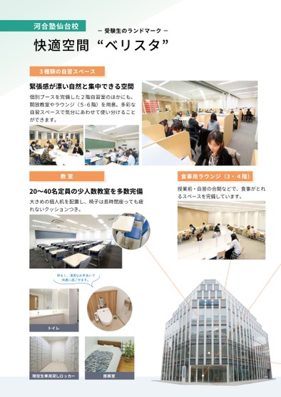 河合塾仙台校快適空間-受験生のランドマーク-“ベリスタ”3種類の自習スペース緊張感が漂い自然と集中できる空間個別ブースを完備した2階自習室のほかにも、開放教室やラウンジ(5-6階)を用意。多彩な自習スペースで気分にあわせて使い分けることができます。教室��~��名定員の少人数教室を多数完備大きめの個人机を配置し、椅子は長時間座っても疲れないクッションつき。食事用ラウンジ(�・4階)授業前・自習の合間などで、食事がとれるスペースを完備しています。明るく、清潔なお手洗いで快適に過ごせます。トイレ現役生専用貸しロッカー医務室
