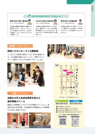 校舎案内東京大学文科二類合格Sさん(仙台第二高校出身)私は河合塾仙台校をこう活用した!九州大学芸術工学部合格Nさん(仙台第二高校出身)東北大学工学部合格Iさん(仙台第三高校出身)河合塾の講師室は開放的で講師への質問がしやすく、またチューターにもすぐ相談ができたので、さまざまな場面で「プロ」に支えていただける環境でした。河合塾は自習室が充実しているのに加え、情報ステーションで大学過去問の閲覧やコピーもできるので、塾の中ですべての学習が完結できる環境でした。自習室は夜遅くまで開いていたので、授業のない日も利用し、家で集中できないときも勉強することができました。東六番丁小学校愛宕上杉通アジュール仙台アカデミア館宮城県庁ベリスタ館江陽グランドホテルアエルホテルドーミーインEXPRESS仙台広瀬通クリスロード名掛丁パルコ地下鉄広瀬通駅広瀬通JR仙台駅東口西口至福島ペデストリアンデッキロフトバスプール地下鉄仙台駅パルコ2七十七銀行本店青葉通りあおば通駅イオン地下鉄勾当台公園駅東二番丁通(国道4号線)仙台市役所MAP〒���-����仙台市青葉区本町�-��-��大学受験科高校グリーンコース���-���-�������-���-����■JR仙台駅西口から徒歩��分■JR仙石線あおば通駅出入口�から徒歩�分■地下鉄南北線広瀬通駅西�出口から徒歩�分■地下鉄南北線・東西線仙台駅北�出口から徒歩�分イベント情報・仙台校の最新情報発信中!LINE友だち追加Instagram講師室・スタッフルーム質問しやすいオープンな講師室一人ひとりの質問に納得いくまで丁寧に指導します。また進路の相談にはチューター(進学アドバイザー)が塾生一人ひとりを手厚くサポートします。情報ステーション全国の大学入試過去問等を揃えた進学情報スペース豊富な入試情報にアクセスできる情報ステーション。過去問や各大学の要項、河合塾発行の情報誌など入試情報をいち早く収集できます。コピー機
