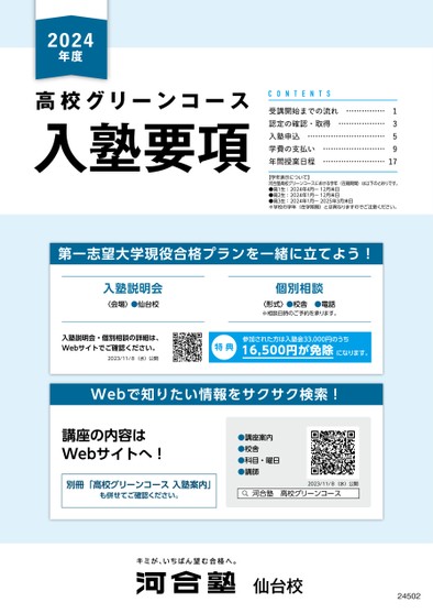 2024年度高校グリーンコース入塾要項受講開始までの流れ認定の確認・取得入塾申込学費の支払い年間授業日程1……………3………………5………………………………………………9……………………17【学年表示について】河合塾高校グリーンコースにおける学年(在籍期間)は以下のとおりです。●高1生:2024年4月〜12月末日●高2生:2024年1月〜12月末日●高3生:2024年1月〜2025年3月末日※学校の学年(在学期間)とは異なりますのでご注意ください。第一志望大学現役合格プランを一緒に立てよう!入塾説明会〈会場〉●仙台校個別相談〈形式〉●校舎●電話※相談日時のご予約を承ります。入塾説明会・個別相談の詳細は、Webサイトでご確認ください。2023/11/8(水)公開特典参加された方は入塾金33,000円のうちになります。16,500円が免除Webで知りたい情報をサクサク検索!講座の内容はWebサイトへ!●講座案内●校舎●科目・曜日●講師別冊「高校グリーンコース入塾案内」も併せてご確認ください。2023/11/8(水)公開河合塾高校グリーンコース仙台校24502