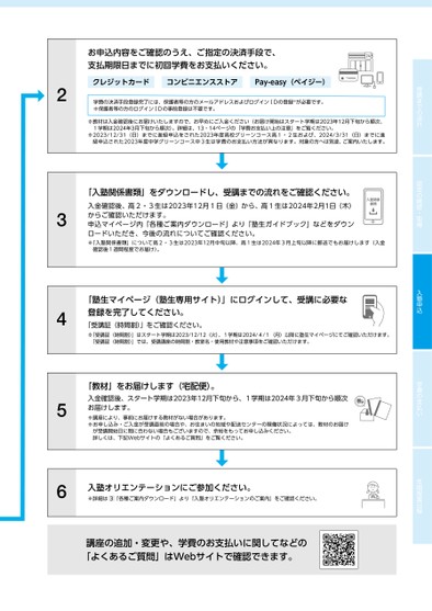 受講までの流れ認定の確認・取得入塾申込学費の支払い年間授業日程23456お申込内容をご確認のうえ、ご指定の決済手段で、支払期限日までに初回学費をお支払いください。クレジットカードコンビニエンスストアPay-easy(ペイジー)学費の決済手段登録完了には、保護者等の方のメールアドレスおよびログインⅠDの登録※が必要です。※保護者等の方のログインⅠDの事前登録は不要です。※教材は入金確認後にお届けいたしますので、お早めにご入金ください(お届け開始はスタート学期は2023年12月下旬から順次、1学期は2024年3月下旬から順次)。詳細は、13・14ページの「学費お支払い上の注意」をご覧ください。※2023/12/31(日)までに進級申込をされた2023年度高校グリーンコース高1・2生および、2024/3/31(日)までに進級申込された2023年度中学グリーンコース中3生は学費のお支払い方法が異なります。対象の方へは別途、ご案内いたします。「入塾関係書類」をダウンロードし、受講までの流れをご確認ください。入金確認後、高2・3生は2023年12月1日(金)から、高1生は2024年2月1日(木)からご確認いただけます。申込マイページ内「各種ご案内ダウンロード」より「塾生ガイドブック」などをダウンロードいただき、今後の流れについてご確認ください。※「入塾関係書類」について高2・3生は2023年12月中旬以降、高1生は2024年3月上旬以降に郵送でもお届けします(入金確認後1週間程度でお届け)。入塾関係書類「塾生マイページ(塾生専用サイト)」にログインして、受講に必要な登録を完了してください。「受講証(時間割)」をご確認ください。※「受講証(時間割)」はスタート学期は2023/12/12(火)、1学期は2024/4/1(月)以降に塾生マイページにてご確認いただけます。「受講証(時間割)」では、受講講座の時間割・教室名・使用教材や注意事項をご確認いただけます。「教材」をお届けします(宅配便)。入金確認後、スタート学期は2023年12月下旬から、1学期は2024年3月下旬から順次お届けします。※講座により、事前にお届けする教材がない場合があります。※お申し込み・ご入金が受講直前の場合や、お住まいの地域や配送センターの稼働状況によっては、教材のお届けが受講開始日に間に合わない場合もございますので、余裕をもってお申し込みください。詳しくは、下記Webサイトの「よくあるご質問」をご覧ください。入塾オリエンテーションにご参加ください。※詳細は「各種ご案内ダウンロード」より「入塾オリエンテーションのご案内」をご確認ください。3講座の追加・変更や、学費のお支払いに関してなどの「よくあるご質問」はWebサイトで確認できます。