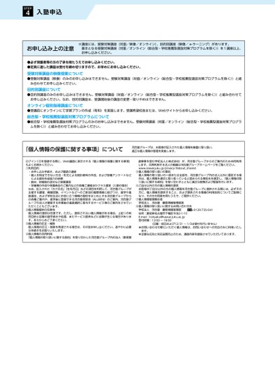 4STEP入塾申込お申し込み上の注意※講座には、受験対策講座(対面/映像/オンライン)、目的別講座(映像/e-ラーニング)があります。基本となる受験対策講座(対面/オンライン総合型・学校推薦型選抜対策プログラムを除く〉)を1講座以上、お申し込みください。●必ず保護者等の方の了承を得たうえでお申し込みください。●定員に達した講座は受付を締め切りますので、お早めにお申し込みください。受験対策講座の映像授業について●受験対策講座(映像)のみのお申し込みはできません。受験対策講座(対面/オンライン総合型・学校推薦型選抜対策プログラムを除く〉)と組み合わせてお申し込みください。目的別講座について●目的別講座のみのお申し込みはできません。受験対策講座(対面/オンライン総合型・学校推薦型選抜対策プログラムを除く〉)と組み合わせてお申し込みください。なお、目的別講座は、受講開始後の講座の変更・取りやめはできません。オンライン個別指導講座について●受講前にオンラインにて学習プランの作成(有料)を実施します。受講希望校舎または、Webサイトからお申し込みください。総合型・学校推薦型選抜対策プログラムについて●総合型・学校推薦型選抜対策プログラムのみのお申し込みはできません。受験対策講座(対面/オンライン総合型・学校推薦型選抜対策プログラムを除く〉)と組み合わせてお申し込みください。「個人情報の保護に関する事項」について河合塾グループは、お客様が記入された個人情報を厳重に取り扱い、適正な個人情報の管理を実施します。ログインⅠDを登録する際に、Web画面に表示される「個人情報の保護に関する事項」もよくお読みください。①利用目的・お申し込み手続き、および確認の連絡・個人を特定できない方法・形式による統計資料の作成、および各種アンケートなどによる資料作成協力の依頼・教材、時間割の送付など授業運営・学籍簿の作成や保護者会のご案内などの各種ご連絡ほかクラス運営(入塾の場合)なお、記入された「カナ氏名」「生年月日」などの項目を利用して、河合塾グループが主催する講習、模擬試験、イベントなどへのご参加の履歴情報と結びつけ、進学や進路選定、および学校生活にお役に立つ情報の提供をはじめとする河合塾グループからの各種ご案内や、進学後に登録できる河合塾同窓会(ALUMNI)のご案内、河合塾グループの法人が運営する卒業後の進路選択に寄与するサービス等のご案内をさせていただくこともございます。②個人情報提供の任意性個人情報の提供は任意です。ただし、提供されない個人情報がある場合、上記①の利用目的に記載の諸手続きや処理、またサービス提供などに支障が生じる場合があります。あらかじめご了承ください。③個人情報の訂正・削除個人情報の訂正・削除を希望される場合は、その旨お申し出ください。速やかに必要な手続きをお取りいたします。④個人情報の共同利用「個人情報の取り扱いに関する契約」を取り交わした河合塾グループ内の法人(教育関します。共同利用する法人の範囲は河合塾グループホームページをご覧ください。連事業を営む学校法人と株式会社)が、河合塾グループからのご案内のため共同利用www.kawaijuku.jp/privacy/#about_shared⑤個人情報の取り扱いの委託個人情報の取り扱いの一部または全部を、河合塾グループ内の法人以外に委託する場合は、個人情報を適切に取り扱っていると認められる委託先を選定し、「個人情報の取り扱いに関する契約」を取り交わすとともに適正な管理および監督を行います。⑥ご自分以外の方の個人情報の提供お客様がご自分以外の方の個人情報を河合塾グループに提供される際には、必ずその方に、個人情報を提供すること、および提供される情報の利用目的についてご説明になり、その方の同意を得たうえで、ご提供ください。⑦個人情報管理責任者学校法人河合塾顧客情報管理部長⑧個人情報の取り扱いに関するお問い合わせ先学校法人河合塾顧客情報管理部住所:愛知県名古屋市千種区今池2-1-10E-mail:kokyaku@kawai-juku.ac.jp受付時間:12:00〜18:000120-735-041(日曜・祝日および12/31〜1/3は受付を行いません)お問い合わせの際にいただく個人情報は、お問い合わせへの対応のみに利用いたし正確な応対と対応品質向上のため、通話内容を録音させていただいております。ます。