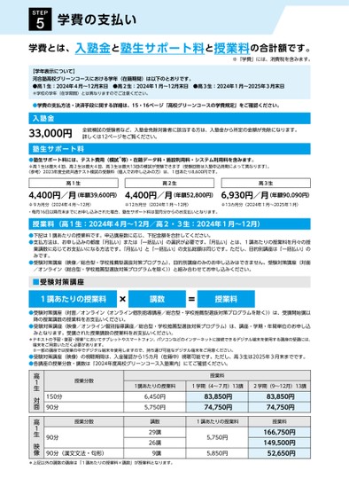 学費の支払い5STEP学費とは、入塾金と塾生サポート料と授業料の合計額です。※「学費」には、消費税を含みます。【学年表示について】河合塾高校グリーンコースにおける学年(在籍期間)は以下のとおりです。●高1生:2024年4月~12月末日●高2生:2024年1月~12月末日●高3生:2024年1月~2025年3月末日※学校の学年(在学期間)とは異なりますのでご注意ください。●学費の支払方法・決済手段に関する詳細は、15・16ページ「高校グリーンコースの学費規定」をご確認ください。入塾金33,000円塾生サポート料全統模試の受験者など、入塾金免除対象者に該当する方は、入塾金から所定の金額が免除になります。詳しくは12ページをご覧ください。●塾生サポート料には、テスト費用(模試※等)・在籍データ料・施設利用料・システム利用料を含みます。※高1生は最大4回、高2生は最大4回、高3生は最大13回の模試が受験できます(受験回数は入塾申込時期によって異なります)。〈参考〉2023年度全統共通テスト模試の受験料(個人でお申し込みの方)は、1回あたり8,600円です。高1生高2生高3生4,400円/月(年額39,600円)4,400円/月(年額52,800円)6,930円/月(年額90,090円)※9カ月分(2024年4月~12月)・毎月16日以降月末までにお申し込みされた場合、塾生サポート料は翌月分からのお支払いとなります。※12カ月分(2024年1月~12月)※13カ月分(2024年1月~2025年1月)授業料(高1生:2024年4月~12月/高2・3生:2024年1月~12月)●下記は1講あたりの授業料です。申込講座数に応じ、下記金額を合計してください。●支払方法は、お申し込みの都度「月払い」または「一括払い」の選択が必要です。「月払い」とは、1講あたりの授業料を月々の授業講数に応じてお支払いになる方法です。「月払い」と「一括払い」の支払総額は同じです。ただし、目的別講座は「一括払い」のみです。●受験対策講座(映像/総合型・学校推薦型選抜対策プログラム)、目的別講座のみのお申し込みはできません。受験対策講座(対面/オンライン〈総合型・学校推薦型選抜対策プログラムを除く〉)と組み合わせてお申し込みください。■受験対策講座1講あたりの授業料講数授業料●受験対策講座(対面/オンライン〈オンライン個別指導講座/総合型・学校推薦型選抜対策プログラムを除く〉)は、受講開始講以降の授業講数の授業料をお支払いください。●受験対策講座(映像/オンライン個別指導講座/総合型・学校推薦型選抜対策プログラム)は、講座・学期・年間単位のお申し込みとなります。受講された授業講数の授業料をお支払いください。*テキストの予習・復習・授業※においてタブレットやスマートフォン、パソコンなどのインターネットに接続できるデジタル端末を使用する講座の受講には、端末をご用意いただく必要があります。※一部の講座では授業の中でデジタル端末を使用しますので、持ち運び可能なデジタル端末をご用意ください。●受験対策講座(映像)の視聴期間は、入金確認から15カ月(在籍中)視聴可能です。ただし、高3生は2025年3月末までです。●各講座の授業分数・講数は「2024年度高校グリーンコース入塾案内」にてご確認ください。1講あたりの授業料1学期(4~7月)13講2学期(9~12月)13講授業料6,450円5,750円講数29講26講9講83,850円74,750円1講あたりの授業料5,750円5,850円83,850円74,750円授業料166,750円149,500円52,650円授業分数授業分数150分90分90分90分(漢文文法・句形)高1生対面高1生映像*上記以外の講数の講座は「1講あたりの授業料×講数」が授業料となります。