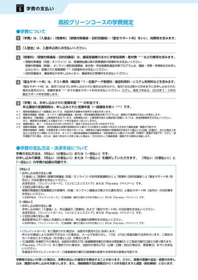 5STEP学費の支払い●学費について高校グリーンコースの学費規定12345「学費」は、「入塾金」・「授業料」(受験対策講座・目的別講座)・「塾生サポート料」をいい、消費税を含みます。「入塾金」は、入塾申込時にお支払いください。「授業料」(受験対策講座・目的別講座)は、講座受講費のほかに学習指導費・教材費(※1)などの費用を含みます。受験対策講座(対面/オンライン)は、受講開始講以降の授業講数の授業料をお支払いください。受験対策講座(映像)、オンライン個別指導講座、総合型・学校推薦型選抜対策プログラムは、講座・学期・年間単位のお申し込みとなり、受講された授業講数(※2)の授業料をお支払いください。目的別講座は、講座単位のお申し込みとなり、講座単位の授業料をお支払いください。「塾生サポート料」は、テスト費用(模試等※3)・在籍データ管理料・施設利用料・システム利用料などを含みます。「塾生サポート料」は、毎月15日までにお申し込みされた場合は当月分から、毎月16日以降から月末までにお申し込みされた場合は翌月分から、受講年度末(※4)までの塾生サポート料をお支払いください。ただし、高校3年生は、2025年2・3月の塾生サポート料を免除します。「学費」は、お申し込みされた受講年度(※4)の料金です。申込講座の受講期間は、申し込みされた受講年度(一部講座を除く(※5))です。※1個別指導講座など一部講座においては、別途有料の副教材を使用する場合があります。※2受験対策講座(映像)、オンライン個別指導講座、総合型・学校推薦型選抜対策プログラムは、講単位で授業料の支払いが発生します。※3模試等は、対象模試・上限回数を定めています。対象模試以外・上限回数を超える模試等の受験については、別途受験費用をお支払いください。また、模試等の未受験による塾生サポート料の返金は一切いたしません。※4受講年度は、高1・2年生は2024年12月末まで、高校3年生は2025年3月末までです。※5受験対策講座(映像)・目的別講座は受講可能開始日から最大15カ月間または高校3年生の3月末まで講座受講・閲覧が可能です。受験対策講座(映像)の受講を取りやめた場合であっても、視聴済みの講は各講座の受講開始可能日から最大15カ月間(在籍中)、または高校3年生の3月末までご視聴いただけます。オンライン個別指導講座の受講期間は、初回授業日から最大15カ月間(在籍中)受講が可能です。ただし、途中退塾された場合、または、高校3年生の3月末に達した場合は、その日をもって講座受講・閲覧できる権利は消滅します。●学費の支払方法・決済手段について学費の支払方法は、「月払い(分割払い)」または「一括払い」です。お申し込みの都度、「月払い(分割払い)」または「一括払い」を選択していただきます。「月払い(分割払い)」と「一括払い」の学費の総額は同額です。【月払い】お申し込み時の支払い額「入塾金」と「授業料(受験対策講座(対面/オンライン)の初月授業講数分)」と「授業料(目的別講座)」と「塾生サポート料(初月分)」の合計額をお支払いください。決済手段は、「クレジットカード」、「コンビニエンスストア」または「Pay-easy(ペイジー)」です。2回目以降の支払い額受験対策講座の受講講数分の授業料(対面/オンライン講座は欠席された講を含む)と塾生サポート料(当月分)の合計額をお支払いください。※決済手段は、「クレジットカード」、「口座振替(銀行口座からの引き落とし)」または「Pay-easy(ペイジー)」です。【一括払い】お申し込み時の支払い額お申し込み時に「入塾金」と、申込講座の「授業料」および「塾生サポート料」の合計額をお支払いください。決済手段は、「クレジットカード」、「コンビニエンスストア」または「Pay-easy(ペイジー)」です。2回目以降の支払い額追加変更申込で一括払いを選択した場合は、申込講座の授業料をお支払いください。※決済手段は、「クレジットカード」、「口座振替(銀行口座からの引き落とし)」または「Pay-easy(ペイジー)」です。「クレジットカード」をご選択された場合は、当該月の翌月8日に決済します。何らかの理由により決済ができなかった場合は、メールでお知らせし、17日、27日に再度自動で決済を行います。ご契約のカード会社により支払日(引き落とし日)が異なります。「口座振替」を選択された場合は、当該月の翌月27日(金融機関休業日の場合は翌営業日)にご指定の銀行口座から振り替えます。「Pay-easy(ペイジー)」をご選択された場合は、当該月の翌月27日(土曜・日曜・祝日の場合は、翌営業日)までにお支払いください。年度途中でのクレジットカード・口座振替用の銀行口座情報の変更や決済手段の変更は可能です。学費等の支払いが滞った場合は、学費お支払いの督促文を郵送することがあります。さらに、授業の受講や追加・変更のお申し込み、講習のお申し込みをお断りします。また、滞納期間が支払期限日から1カ月を越えますと退塾(契約解除)となります