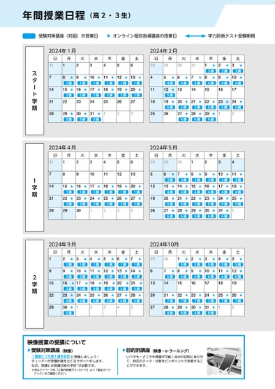 受験対策講座(対面)の授業日オンライン個別指導講座の授業日★学力診断テスト受験期間年間授業日程(高2・3生)日月火水木金土★★★★★★1講1講1講1講1講1講★★★★★★2講2講2講2講2講2講★★★3講3講3講2024年1月3112345678910111213141516171819202122232425262728293031123日月火水木金土★★★3講3講3講★★★★★★4講4講4講4講4講4講★5講★★★★★★6講5講5講5講5講5講★★★6講6講6講2024年2月28293031123456789101112131415161718192021222324252627282912日月火水木金土★★★★★★1講1講1講1講1講1講★★★★★★2講2講2講2講2講2講2024年4月311234567891011121314151617181920212223242526272829301234スタート学期日月火水木金土★★★★★★3講3講3講3講3講3講★★★★★★4講4講4講4講4講4講★★★★★★5講5講5講5講5講5講★★★★★6講6講6講6講6講2024年5月2829301234567891011121314151617181920212223242526272829303111学期日月火水木金土★★★★★5講5講5講5講5講★★★★★★6講6講6講6講6講6講★★★★★★7講7講7講7講7講7講★★★★8講8講8講8講2024年10月293012345678910111213141516171819202122232425262728293031122学期▶受験対策講座(映像)映像授業の受講についてなお、受講には受講日時の予約※が必要です。チューターが受講計画を立てるサポートをします。1講座につき週1講を目安に受講しましょう!※申込マイページ内「ご案内各種ダウンロード」より「塾生ガイドブック」をご確認ください。▶目的別講座(映像・e-ラーニング)て、特定のテーマ・分野をピンポイントで学習するこいつでも・どこでも受講が可能!自分の目的にあわせとができます。日月火水木金土★★★★★★1講1講1講1講1講1講★★★★★★2講2講2講2講2講2講★★★★★★3講3講3講3講3講3講★★★★★★4講4講4講4講4講4講★5講2024年9月12345678910111213141516171819202122232425262728293012345