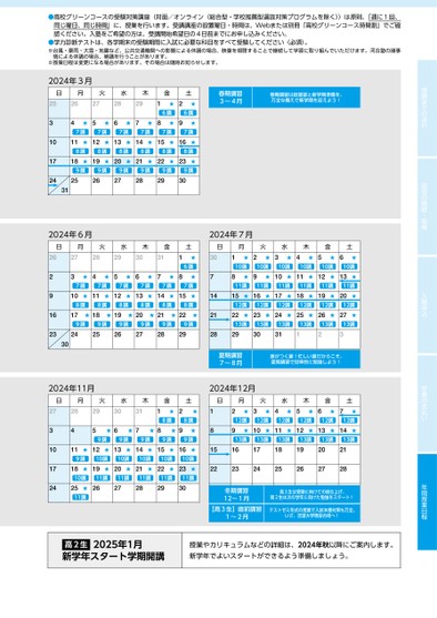 ●高校グリーンコースの受験対策講座(対面/オンライン同じ曜日、同じ時間」に、授業を行います。受講講座の設置曜日・時間は、Webまたは別冊「高校グリーンコース時間割」でご確総合型・学校推薦型選抜対策プログラムを除く〉)は原則、「週に1回、認ください。入塾をご希望の方は、受講開始希望日の4日前までにお申し込みください。●学力診断テストは、各学期末の受験期間に入試に必要な科目をすべて受験してください(必須)。※台風・豪雨・大雪・地震など、公共交通機関への影響による休講の場合、映像を視聴することで継続して学習に取り組んでいただけます。河合塾の諸事情による休講の場合、補講を行うことがあります。※授業日程は変更になる場合があります。その場合は随時お知らせします。受講までの流れ認定の確認・取得入塾申込学費の支払い年間授業日程日月火水木金土★★6講6講★★★★★★7講7講7講7講7講7講★★★★★★8講8講8講8講8講8講★★★★★★9講9講9講9講9講9講2024年3月252627282912345678910111213141516171819202122232425262728293031日月火水木金土★6講★★★★★★7講7講7講7講7講7講★★★★★★8講8講8講8講8講8講★★★★★★9講9講9講9講9講9講2024年6月2627282930311234567891011121314151617181920212223242526272829日月火水木金土13講12講★11講★★10講★13講12講★11講★★10講★13講12講★11講★★10講★13講12講★11講★★10講★13講12講★11講★★10講★13講12講★11講★★10講★2024年7月3012345678910111213141516171819202122232425262728293031123日月火水木金土★★8講8講★★★★★9講9講9講9講9講★★10講★11講★10講★11講★10講★11講★10講★11講★10講★11講9講★★10講11講2024年11月2728293031123456789101112131415161718192021222324252627282930日月火水木金土★12講★13講★12講★13講★12講★13講★12講★13講★12講★13講★12講★13講2024年12月123456789101112131415161718192021222324252627282930311234冬期講習12~1月高3生は受験に向けての総仕上げ、高2生は次の学年に向けた勉強をスタート!【高3生】直前講習1~2月テストゼミ形式の授業で入試本番対策も万全。いざ、志望大学現役合格へ!7~8月夏期講習夏期講習で効率的に勉強しよう!差がつく夏!忙しい夏だからこそ、高2生2025年1月新学年スタート学期開講授業やカリキュラムなどの詳細は、2024年秋以降にご案内します。新学年でよいスタートができるよう準備しましょう。春期講習3~4月春期講習は総復習と新学期準備を。万全な備えで新学期を迎えよう!30