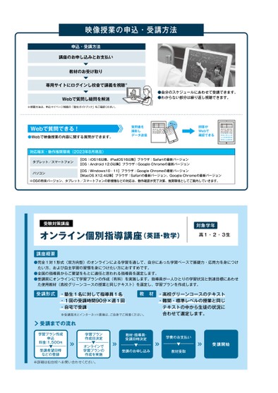 映像授業の申込・受講方法●自分のスケジュールにあわせて受講できます。●わからない部分は繰り返し視聴できます。●Webで映像授業の内容に関する質問ができます。Webで質問できる!※視聴方法は、申込マイページ掲載の「塾生ガイドブック」をご確認ください。講座のお申し込みとお支払い教材のお受け取りWebで質問し疑問を解消専用サイトにログインし校舎で講義を視聴※申込・受講方法※OSの将来バージョン、タブレット/スマートフォンの新機種などの対応は、動作確認が完了次第、推奨環境としてご案内していきます。対応端末・動作推奨環境(2023年8月現在)タブレット/スマートフォン【OS:iOS16以降、iPadOS16以降】ブラウザ:Safariの最新バージョン【OS:Android12.0以降】ブラウザ:GoogleChromeの最新バージョンパソコン【OS:Windows10・11】ブラウザ:GoogleChromeの最新バージョン【MacOSX12.4以降】ブラウザ:Safariの最新バージョン、GoogleChromeの最新バージョンカシャ!質問書を撮影しデータ送信回答がWebで確認できるオンライン個別指導講座(英語・数学)●完全1対1形式(双方向型)のオンラインによる学習を通して、自分にあった学習ペースで基礎力・応用力を身につけたい方、および自主学習の習慣を身につけたい方におすすめです。●全国の指導員からご要望をもとに適任と思われる指導員を選定します。●受講前にオンラインにて学習プランの作成(有料)を実施します。指導員が一人ひとりの学習状況と到達目標にあわせた使用教材(高校グリーンコースの授業と同じテキスト)を選定し、学習プランを作成します。※詳細は仙台校へお問い合わせください。※受講端末とインターネット環境は、ご自身でご用意ください。受験対策講座・塾生1名に対して指導員1名・1回の受講時間90分×週1回・自宅で受講対象学年高1・2・3生講座概要受講形式・高校グリーンコースのテキスト・難関・標準レベルの授業と同じテキストの中から生徒の状況に合わせて選定します。教材受講までの流れ受講開始教材・指導員・受講日時決定受講のお申し込み学費のお支払い教材受取学習プラン作成日決定オンラインで学習プランの作成を実施学習プラン作成申込料金:1,500円受講希望日時などの登録