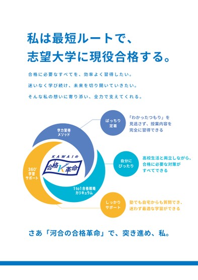 私は最短ルートで、志望大学に現役合格する。合格に必要なすべてを、効率よく習得したい。迷いなく学び続け、未来を切り開いていきたい。そんな私の想いに寄り添い、全力で支えてくれる。ばっちり定着「わかったつもり」を見逃さず、授業内容を完全に習得できる自分にぴったり高校生活と両立しながら、合格に必要な対策がすべてできるしっかりサポート塾でも自宅からも質問でき、迷わず最適な学習ができるさあ「河合の合格革命」で、突き進め、私。