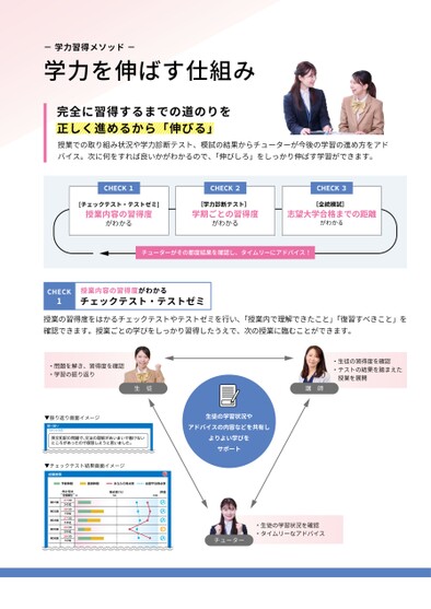 -学力習得メソッド-学力を伸ばす仕組み完全に習得するまでの道のりを正しく進めるから「伸びる」授業での取り組み状況や学力診断テスト、模試の結果からチューターが今後の学習の進め方をアドバイス。次に何をすれば良いかがわかるので、「伸びしろ」をしっかり伸ばす学習ができます。CHECK1[チェックテスト・テストゼミ]授業内容の習得度がわかるCHECK2[学力診断テスト]学期ごとの習得度がわかるCHECK3[全統模試]がわかる志望大学合格までの距離チューターがその都度結果を確認し、タイムリーにアドバイス!CHECK�授業内容の習得度がわかるチェックテスト・テストゼミ授業の習得度をはかるチェックテストやテストゼミを行い、「授業内で理解できたこと」「復習すべきこと」を確認できます。授業ごとの学びをしっかり習得したうえで、次の授業に臨むことができます。・生徒の習得度を確認・テストの結果を踏まえた授業を展開講師生徒の学習状況やアドバイスの内容などを共有しよりよい学びをサポート・生徒の学習状況を確認・タイムリーなアドバイスチューター・問題を解き、習得度を確認・学習の振り返り生徒▼振り返り画面イメージ振り返りコメント入力英文和訳の問題で、文法の理解があいまいで書けないところがあったので復習しようと思いました。▼チェックテスト結果画面イメージ成績推移?予習時間復習時間あなたの得点率全国平均得点率AAADA得点率(%)50評価1000得点/配点全国順位27/30243位28/30158位27/30336位20/30594位28/30160位第01講第02講第03講第05講第08講