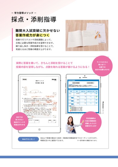 -学力習得メソッド-採点・添削指導難関大入試突破に欠かせない答案作成力が身につく授業で行うテストや添削課題によって、合格に必要な答案作成力を習得できます。繰り返し採点・添削指導を受けることで、見違えるほど答案の精度が上がります。実際に答案を書いて、きちんと添削を受けることで授業内容を習得しながら、点数を取れる答案が書けるようになる!ライバルたちと競い合う!全国での自分の位置もわかる▲成績画面イメージ採点済み答案確認採点済み答案確認採点済み答案DL※資料確認について問題確認と採点済み答案確認は、年度内はいつでも閲覧することが可能です。採点済み答案画像を自分で保管する場合は、採点済み答案DLからダウンロードしてください。設問別成績表設問得点全国平均点全国平均点との差評価46.79.721.615.4+13.4+0.3+4.4+8.6ABAA合計点第1問第2問第3問詳細詳細詳細60/10010/2526/4524/30全国平均得点率よりも10%以上高い全国平均得点率よりも0〜10%高い全国平均得点率よりも0〜10%低い全国平均得点率よりも10%以上低いABCD※評価について河合塾講師は生徒の理解度を把握したうえで授業を行います自分では気づけない減点ポイントや改善点がわかるWebでカンタン!Web上で答案の提出から採点・添削後の答案返却までスピーディーに行うので、時間を空けずに復習ができます。※一部対象外の講座があります。