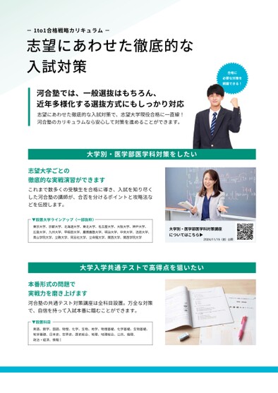 -�to�合格戦略カリキュラム-志望にあわせた徹底的な入試対策河合塾では、一般選抜はもちろん、近年多様化する選抜方式にもしっかり対応志望にあわせた徹底的な入試対策で、志望大学現役合格に一直線!河合塾のカリキュラムなら安心して対策を進めることができます。合格に必要な対策を網羅できる!大学別・医学部医学科対策をしたい志望大学ごとの徹底的な実戦演習ができますこれまで数多くの受験生を合格に導き、入試を知り尽くした河合塾の講師が、合否を分けるポイントと攻略法などを伝授します。▼設置大学ラインアップ(一部抜粋)東京大学、京都大学、北海道大学、東北大学、名古屋大学、大阪大学、神戸大学、広島大学、九州大学、早稲田大学、慶應義塾大学、明治大学、中央大学、法政大学、青山学院大学、立教大学、同志社大学、立命館大学、関西大学、関西学院大学大学別・医学部医学科対策講座についてはこちら▶2024/11/15(金)公開大学入学共通テストで高得点を狙いたい本番形式の問題で実戦力を磨き上げます河合塾の共通テスト対策講座は全科目設置。万全な対策で、自信を持って入試本番に臨むことができます。▼設置科目英語、数学、国語、物理、化学、生物、地学、物理基礎、化学基礎、生物基礎、地学基礎、日本史、世界史、歴史総合、地理、地理総合、公共、倫理、政治・経済、情報Ⅰ