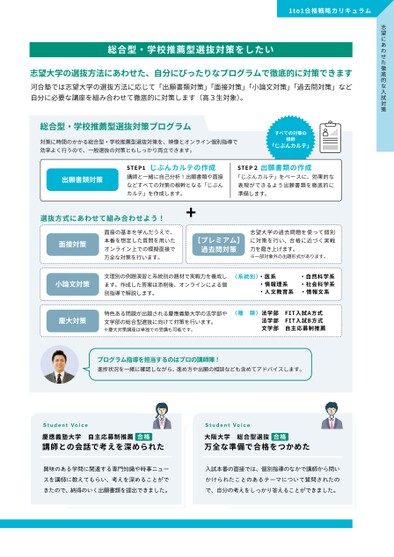 �to�合格戦略カリキュラム志望にあわせた徹底的な入試対策総合型・学校推薦型選抜対策をしたい志望大学の選抜方法にあわせた、自分にぴったりなプログラムで徹底的に対策できます河合塾では志望大学の選抜方法に応じて「出願書類対策」「面接対策」「小論文対策」「過去問対策」など自分に必要な講座を組み合わせて徹底的に対策します(高3生対象)。総合型・学校推薦型選抜対策プログラム対策に時間のかかる総合型・学校推薦型選抜対策を、映像とオンライン個別指導で効率よく行うので、一般選抜の対策ともしっかり両立できます。出願書類対策じぶんカルテの作成STEP�講師と一緒に自己分析!出願書類や面接などすべての対策の根幹となる「じぶんカルテ」を作成します。すべての対策の根幹「じぶんカルテ」出願書類の作成STEP2「じぶんカルテ」をベースに、効果的な表現ができるよう出願書類を徹底的に準備します。選抜方式にあわせて組み合わせよう!面接対策小論文対策慶大対策【プレミアム】過去問対策面接の基本を学んだうえで、本番を想定した質問を用いたオンライン上での模擬面接で万全な対策を行います。文理別の例題演習と系統別の題材で実戦力を養成します。作成した答案は添削後、オンラインによる個別指導で解説します。志望大学の過去問題を使って個別に対策を行い、合格に近づく実戦力を磨き上げます。※一部対象外の出題形式があります。〈系統別〉・医系・自然科学系・情報理系・社会科学系・人文教育系・情報文系特色ある問題が出題される慶應義塾大学の法学部や文学部の総合型選抜に向けて対策を行います。※慶大対策講座は単独での受講も可能です。〈種類〉法学部FIT入試A方式法学部FIT入試B方式文学部自主応募制推薦プログラム指導を担当するのはプロの講師陣!進捗状況を一緒に確認しながら、進め方や出願の相談なども含めてアドバイスします。StudentVoice慶應義塾大学自主応募制推薦講師との会話で考えを深められた合格StudentVoice大阪大学総合型選抜万全な準備で合格をつかめた合格興味のある学問に関連する専門知識や時事ニュー入試本番の面接では、個別指導のなかで講師から問いスを講師に教えてもらい、考えを深めることがでかけられたことのあるテーマについて質問されたのきたので、納得のいく出願書類を提出できました。で、自分の考えをしっかり答えることができました。