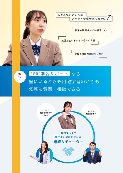 わからないところは、いつでも質問できるのかな?授業の疑問はすぐに解決したい勉強方法があっているのか不安受験や進路の相談をしたい相談できるからいつでも安心!迷いなく勉強できる!���°学習サポートなら塾にいるときも自宅学習のときも気軽に質問・相談できる解決!最強タッグで「伸びる」学習をアシスト講師&チューター