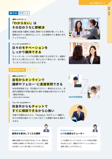 質問・相談���°学習サポートWEB学習相談講師によるサポートサポート塾での「わからない」はその日のうちに即解決授業の前後で講師に気軽に質問できる環境が整っています。疑問点をすぐに解決することで、次の授業までに着実に学力アップできます。チューターによるサポート日々のモチベーションをしっかり維持できるチューターは、いつでも気軽に相談できる存在です。成績が思うように伸びないとき、周りと比べて焦るとき、気が緩んでしまうときなどにも支えとなります。講師によるサポートサポート自宅学習での自宅からオンラインで講師やフェロー※に直接質問できるWEB学習相談では、河合塾のテキスト・教材はもちろん、自習中の疑問点や学習の進め方に関する相談も受け付けています(事前予約制)。※質問対応専門の学習指導員チューターによるサポート校舎外からもチャットですぐに相談できるから心強い対面での相談はもちろん、「Studyplus」内のチャット機能で、日々の学習を進めていくなかで出てくる課題や悩みを相談できます。StudentVoice疑問点を解決してくれる講師StudentVoiceいつも親身なチューター講師は授業ではやる気を引き出してくれ、授業以外の時間では質問にも丁寧に答えてくれたので、疑問点を残すことなく前に進むことができました。いつも親身になってくれるチューターの存在が精神的な支えとなり、最後までモチベーションを保って勉強に励むことができました。