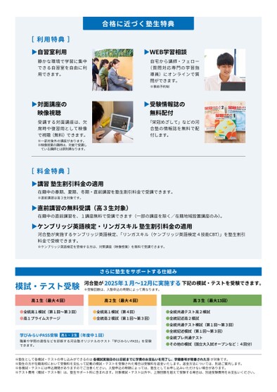 合格に近づく塾生特典▶WEB学習相談自宅から講師・フェロー(質問対応専門の学習指導員)にオンラインで質問ができます。※事前予約制▶受験情報誌の無料配付「栄冠めざして」などの河合塾の情報誌を無料で配付します。[利用特典]▶自習室利用静かな環境で学習に集中できる自習室を自由に利用できます。▶対面講座の映像視聴受講する対面講座は、欠席時や復習用として映像で視聴(無料)できます。※一部対象外の講座があります。※映像授業の講師は、対面で受講している講師とは原則異なります。[料金特典]▶講習塾生割引料金の適用在籍中の春期、夏期、冬期・直前講習を塾生割引料金で受講できます。※直前講習は高3生対象です。在籍中の直前講習を、1講座無料で受講できます(一部の講座を除く/在籍地域設置講座のみ)。▶直前講習の無料受講(高3生対象)▶ケンブリッジ英語検定・リンガスキル塾生割引料金の適用河合塾が実施するケンブリッジ英語検定、「リンガスキル(ケンブリッジ英語検定4技能CBT)」を塾生割引料金で受検できます。※ケンブリッジ英語検定を受検する方は、対策講座(映像授業)を無料で受講できます。さらに塾生をサポートする仕組み河合塾が����年1月~��月に実施する下記の模試・テストを受験できます。※受験回数は、入塾申込の時期によって異なります。模試・テスト受験高1生(最大4回)●全統高1模試(第1回~第3回)●高1プライムステージ高2生(最大4回)●全統高1模試(第4回)●全統高2模試(第1回~第3回)高3生(最大��回)●全統共通テスト高2模試●全統記述高2模試●全統共通テスト模試(第1回~第3回)●全統記述模試(第1回~第3回)●全統プレ共通テスト●その他の模試(国立大入試オープンなど:4回分)学びみらいPASS受験職業や学問の適性などを診断する河合塾オリジナルのテスト「学びみらいPASS」を受験できます。(年度中1回)高1・2生※塾生として各模試・テストの申し込みができるのは各模試実施日の��日前までに学費のお支払いを完了し、学籍番号が発番された方が対象です。※塾生の方が在籍高校において受験料を支払って記載の模試・テストを受験された場合は受験料を返金いたします。返金方法については、別途ご案内します。※各模試・テストには申込期間がありますのでご注意ください。入塾申込の時期によっては、塾生としてお申し込みいただけない場合があります。※テスト費用(模試・テスト等)は、塾生サポート料に含まれます。対象模試・テスト以外や、上限回数を超えて受験する場合は、別途受験費用をお支払いください。