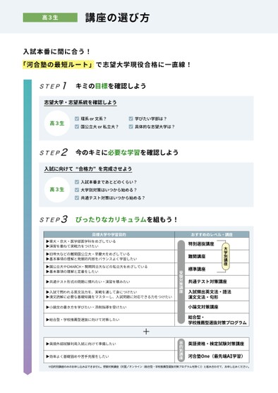 大学別講座おすすめのレベル・講座特別選抜講座難関講座標準講座共通テスト対策講座入試頻出英文法・語法漢文文法・句形小論文対策講座総合型・学校推薦型選抜対策プログラム受験対策講座英語資格・検定試験対策講座河合塾One(最先端AI学習)目的別講座目標大学や学習目的▶東大・京大・医学部医学科をめざしている▶演習を重ねて実戦力をつけたい▶旧帝大などの難関国公立大・早慶大をめざしている▶基本事項の理解と発展的内容をバランスよく学習したい▶国公立大やGMARCH・関関同立大などの私立大をめざしている▶基本事項の理解と定着をしたい▶共通テスト形式の問題に慣れたい・演習を積みたい▶入試で問われる英文法力を、実戦を通して身につけたい▶漢文読解に必要な基礎知識をマスターし、入試問題に対応できる力をつけたい▶小論文の書き方を学びたい・添削指導を受けたい▶総合型・学校推薦型選抜に向けて対策したい+▶英語外部試験利用入試に向けて準備したい▶効率よく基礎固めや苦手克服をしたい※目的別講座のみのお申し込みはできません。受験対策講座(対面/オンライン〈総合型・学校推薦型選抜対策プログラムを除く〉)と組み合わせて、お申し込みください。高3生講座の選び方入試本番に間に合う!「河合塾の最短ルート」で志望大学現役合格に一直線!STEP1キミの目標を確認しよう志望大学・志望系統を確認しよう高3生理系or文系?国公立大or私立大?学びたい学部は?具体的な志望大学は?STEP2今のキミに必要な学習を確認しよう入試に向けて“合格力”を完成させよう高3生入試本番まであとどのくらい?大学別対策はいつから始める?共通テスト対策はいつから始める?STEP3ぴったりなカリキュラムを組もう!