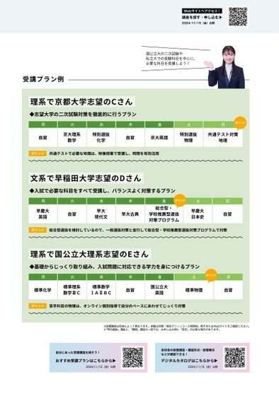 Webサイトへアクセス!講座を探す・申し込む▶2024/11/15(金)公開国公立大の二次試験や私立大での受験科目を中心に、必要な科目を受講しよう!受講プラン例理系で京都大学志望のCさん◆志望大学の二次試験対策を徹底的に行うプラン木自習月自習京大理系特別選抜火水数学化学金京大英語土特別選抜物理日ポイント共通テスト対策地理ポイント共通テストで必要な地理は、映像授業で受講し、時間を有効活用文系で早稲田大学志望のDさん◆入試で必要な科目をすべて受講し、バランスよく対策するプラン月早慶大英語ポイント火自習水早大現代文木早大古典金ポイント総合型・学校推薦型選抜対策プログラム土早慶大日本史日自習総合型選抜を検討しているので、一般選抜対策と並行して総合型・学校推薦型選抜対策プログラムで対策理系で国公立大理系志望のEさん◆基礎からじっくり取り組み、入試問題に対応できる学力を身につけるプラン土月火水金標準化学標準理系数学ⅢC標準数学ⅠAⅡBC木自習国公立大英語ポイント日自習標準物理ポイント苦手科目の物理は、オンライン個別指導で自分のペースにあわせてじっくり対策※設置講座は校舎によって異なります。詳細は別冊「高校グリーンコース時間割」冊子またはWebサイトをご確認ください。※「特別選抜」講座と、「難関」講座の一部では、お申し込み時に「認定」が必要な場合があります。自分にあった受講講座を探そう!おすすめ受講プランはこちらから▶2024/11/15(金)公開各校舎の設置講座・講座形式・設置曜日などが確認できる!デジタルカタログはこちらから▶2024/11/15(金)公開