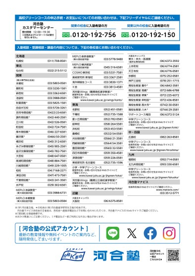 高校グリーンコースの申込手続・お支払いについてのお問い合わせは、下記フリーダイヤルにご連絡ください。河合塾カスタマーセンター受付時間12:00〜19:30※日祝および12/31〜1/3は受付を行いません。関東の校舎に入塾希望の方関東以外の校舎に入塾希望の方0120-19●2-75●60120-19●2-15●0入塾相談・受講相談・講座の内容については、下記の各校舎にお問い合わせください。北海道札幌校東北仙台校関東〈東大専門特化校舎〉本郷校麹町校新宿校池袋校秋葉原館*自由が丘校吉祥寺現役館*調布現役館*立川校町田校厚木現役館*藤沢館*横浜校あざみ野現役館*金沢文庫現役館*大宮校南浦和現役館*川越現役館*柏校津田沼校千葉現役館*水戸校MEPLO池袋教室*(東大現役進学塾)MEPLO本郷教室(東大現役進学塾)(011)708-8581(022)215-5112(03)5803-0581(03)3230-1581(03)3362-6581(03)3988-0581(03)5825-1581(03)5726-3261(0422)23-6581(042)440-2581(042)526-0581(042)724-7581(046)227-6581(0466)50-2581(045)312-6581(045)905-2581(045)782-7581(048)647-0581(048)884-7581(049)229-1005(04)7168-2271(047)473-7581(043)241-3581(029)302-6581(03)3988-6731(03)5803-0584MEPLO表参道教室*(東大現役進学塾)MEPLO横浜教室*(東大現役進学塾)(03)5778-9480(045)316-6581www.kawai-juku.ac.jp/winɡs/kanto/(03)5331-7581(03)3367-2581(03)3830-1371(03)3813-4581COSMO東京校美術研究所新宿校海外帰国生コースK会河合塾Winɡs(難関高校進学教室)*教室所在地・お問い合わせ先はWebサイトにてご確認ください。東海名駅校千種校星ヶ丘現役館*岐阜校浜松校豊橋校刈谷現役館*岡崎現役館*豊田現役館*四日市現役館*津現役館*美術研究所名古屋校小学・中学グリーンコース教室所在地・お問い合わせ先はWebサイトにてご確認ください。河合塾Winɡs(難関公立高校進学教室)*教室所在地・お問い合わせ先はWebサイトにてご確認ください。近畿大阪北キャンパス大阪校(052)451-0581(052)735-1588(052)782-0581(058)264-5581(053)453-5581(0532)54-0581(0566)21-3581(0564)54-3581(0565)32-5581(059)350-4581(059)226-0581(052)735-1596www.kawai-juku.ac.jp/jhɡreen/tokai/www.kawai-juku.ac.jp/winɡs/tokai/(06)6375-8581(06)6372-3592(06)6774-2581(06)6776-0581(075)252-0581(078)251-1715(06)6842-3581(072)686-6788(072)225-6072(072)436-8581(0742)30-0581(0744)29-3581(06)6372-5124大阪北キャンパス東大・京大・医進館(高卒生専用校舎)上本町校天王寺校京都校神戸三宮校現役生教室豊中*現役生教室高槻*現役生教室堺東*現役生教室岸和田*現役生教室西大寺*現役生教室八木*サポートコース梅田中学グリーンコース校舎所在地・お問い合わせ先はWebサイトにてご確認ください。中・四国広島校中学グリーンコース校舎所在地・お問い合わせ先はWebサイトにてご確認ください。www.kawai-juku.ac.jp/jhɡreen/hiroshima/九州福岡校北九州現役館*中学グリーンコース校舎所在地・お問い合わせ先はWebサイトにてご確認ください。河合塾マナビス校舎所在地はWebサイトにてご確認ください。(092)714-0581(093)330-6581www.kawai-juku.ac.jp/jhɡreen/fukuoka/www.kawai-juku.ac.jp/jhɡreen/kinki/(082)263-8581www.manavis.com/(03)3512-5771※(学)河合塾主催。*の校舎は(株)河合塾進学研究社主催の校舎です。河合塾マナビス各校舎の主催者は、各校舎へ直接お電話などでお問い合わせいただくか、河合塾マナビスのWebサイトでご確認ください。※「現役館」は登録商標です。※おかけ間違いにご注意ください。ⅠP電話など一部ご利用になれない場合があります。河合塾SNS公式アカウント一覧はこちらから▶
