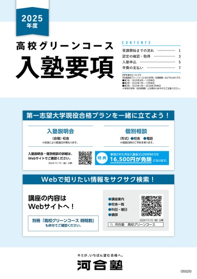 2025年度高校グリーンコース入塾要項受講開始までの流れ認定の確認・取得入塾申込学費の支払い……………………………………………………………………………1357【学年表示について】河合塾高校グリーンコースにおける学年(在籍期間)は以下のとおりです。●高1生:2025年4月〜12月末日●高2生:2025年1月〜12月末日●高3生:2025年1月〜2026年3月末日※学校の学年(在学期間)とは異なりますのでご注意ください。第一志望大学現役合格プランを一緒に立てよう!入塾説明会〈会場〉校舎※校舎により実施日が異なります。個別相談〈形式〉●校舎●電話※相談日時のご予約を承ります。入塾説明会・個別相談の詳細は、Webサイトでご確認ください。2024/11/15(金)公開特典参加された方は入塾金33,000円のうちになります。16,500円が免除Webで知りたい情報をサクサク検索!講座の内容はWebサイトへ!●講座案内●校舎一覧●科目・曜日●講師別冊「高校グリーンコース時間割」も併せてご確認ください。2024/11/15(金)公開河合塾高校グリーンコース05520